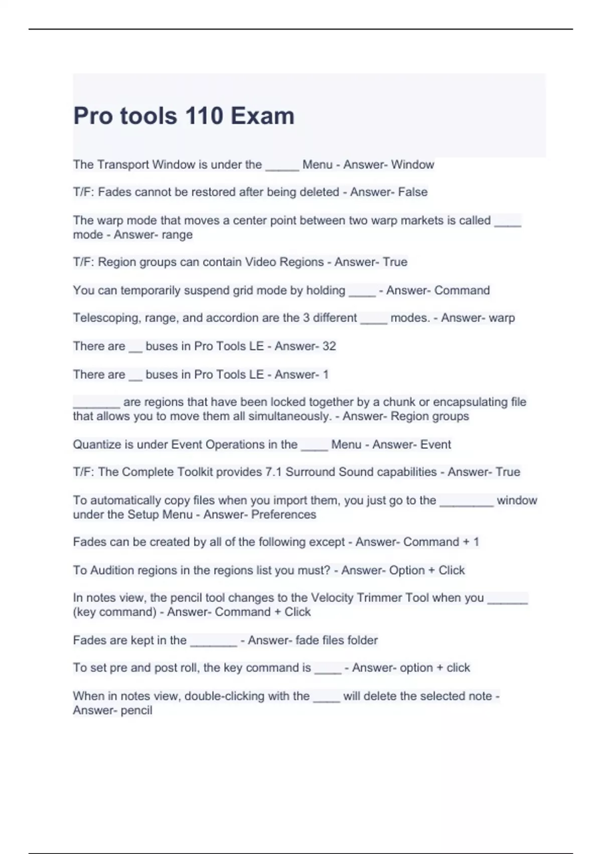 Exam of 6 pages for the course Pro Tools 110 at Pro Tools 110 (Pro tools 110 Exam)