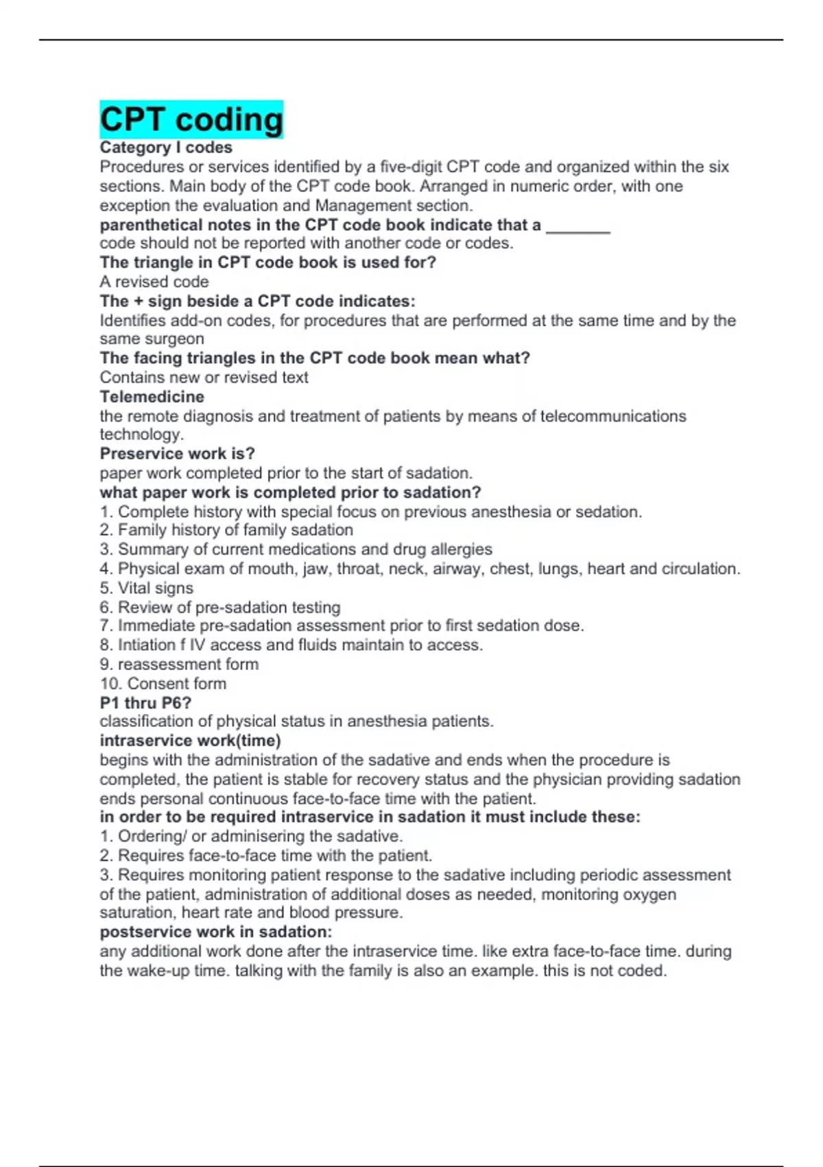 CPT coding Category I codes Procedures or services identified by a five-digit CPT code and organized within the six sections. Main body of the CPT code book. Arranged in numeric order, with one exception the evaluation and Management section. parenthetical notes in the CPT code book indicate that a _______ code should not be reported with another code or codes. The triangle in CPT code book is used for? A revised code The + sign beside a CPT code indicates: Identifies add-on codes, for procedures that are performed at the same time and by the same surgeon The facing triangles in the CPT code book mean what? Contains new or revised text Telemedicine the remote diagnosis and treatment of patients by means of telecommunications technology. Preservice work is? paper work completed prior to the start of sadation. what paper work is completed prior to sadation? 1. Complete history with special focus on previous anesthesia or sedation. 2. Family history of family sadation 3. Summary of current medications and drug allergies 4. Physical exam of mouth, jaw, throat, neck, airway, chest, lungs, heart and circulation. 5. Vital signs 6. Review of pre-sadation testing 7. Immediate pre-sadation assessment prior to first sedation dose. 8. Intiation f IV access and fluids maintain to access. 9. reassessment form 10. Consent form P1 thru P6? classification of physical status in anesthesia patients. intraservice work(time) begins with the administration of the sadative and ends when the procedure is completed, the patient is stable for recovery status and the physician providing sadation ends personal continuous face-to-face time with the patient. in order to be required intraservice in sadation it must include these: 1. Ordering/ or adminisering the sadative. 2. Requires face-to-face time with the patient. 3. Requires monitoring patient response to the sadative including periodic assessment of the patient, administration of additional doses as needed, monitoring oxygen saturation, heart rate and blood pressure. postservice work in sadation: any additional work done after the intraservice time. like extra face-to-face time. during the wake-up time. talking with the family is also an example. this is not coded. SOAP Subjective, Objective, Assessment, and Plan layout in the medical record from the physician. CPT modifiers: there a two-digit suffix entered at the end of a CPT code. CPT Modifiers Identify how the service provided across from unusual description. Some affect payment, but others are informational only. CPT modifiers A two-character numeric descriptor used only with CPT codes. HCPCS modifiers A two character alphanumeric suffix. modifiers are used_______? Most frequently on surgery and or E/M codes and lab codes. Also common to have a hyphen in front of the modifier to separate it from the code number. CPT Modifiers are not used when_________? being entered for billing. Medicare Physician Fee Schedule Database ( MPFSDB): provides information about codes that can be used with modifiers and subsequent impact on reimbursement. ICD-10-CM and ICD-10-PCS do not have________? modifiers If nothing unusual is documented in the medical record, then you most likely will not use a modifier unless___________ It is to indicate a bilateral procedures or a HCPCS modifier to indicate the side if the body or anatomical things. HCPCS codes Healthcare Common Procedure Coding System -32 Mandatef services modifier used when required by a third-party payer, court, or other authory to perform the procedure. Second surgical opinion. -99 Multiple Modifiers Used when more than four modifiers required on a single CPT code. -GA Modifier used to allow the provider to bill the patient if medicare does not pay for the service. medical necessity not met usually. -GZ Modifier indicates an unsigned ABN and that services are expected to be denied.(Physician can not bill the patient). ABN stand for what in medical coding? Advance Beneficiary Notice Anatomic site modifiers are used on all sites except for the _____. Skin CPT modifier 50 must be used for bilateral procedures!!!! Evaluation and Management modifiers: