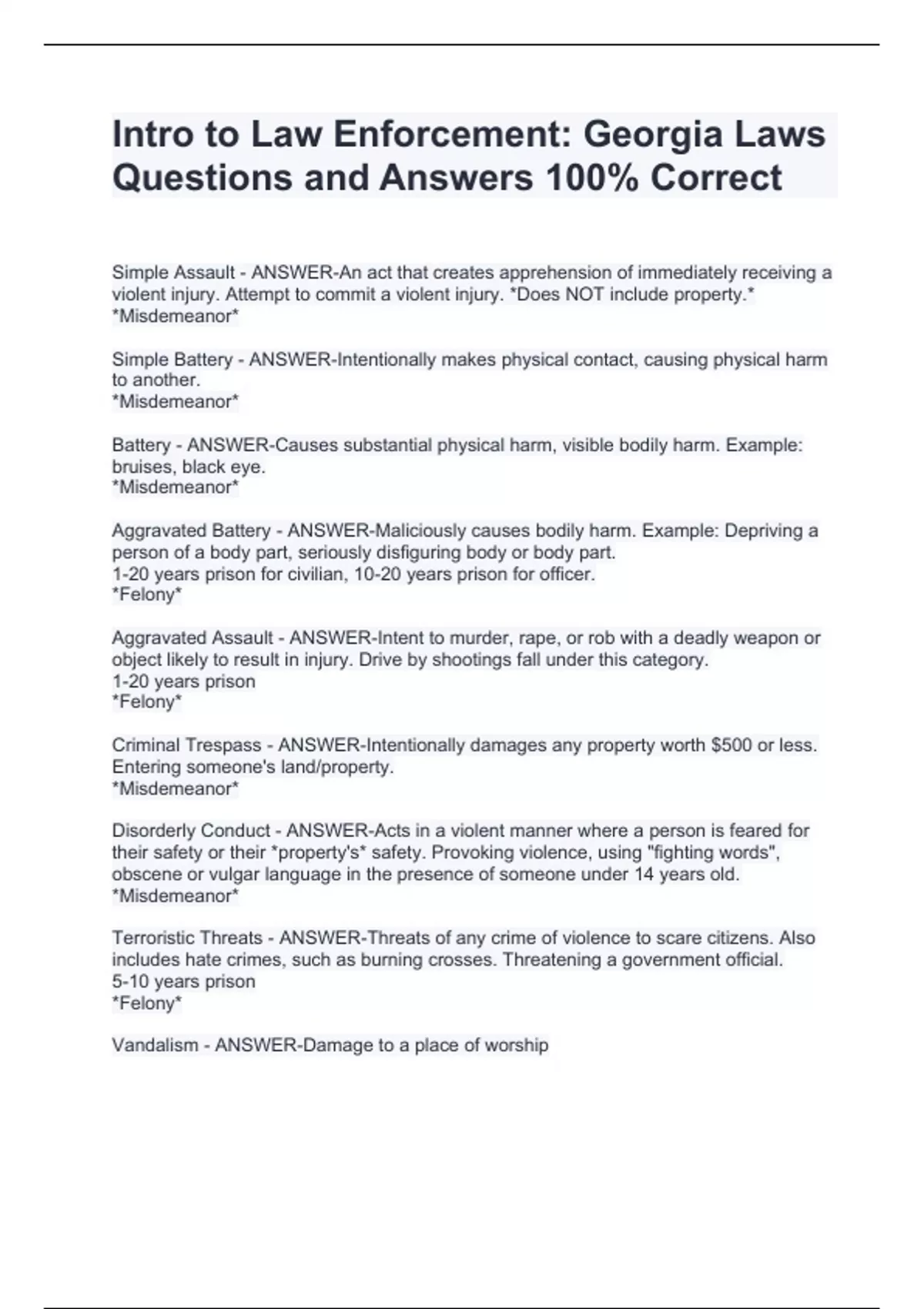 Intro to Law Enforcement: Georgia Laws Questions and Answers 100% CorrectIntro to Law Enforcement: Georgia Laws Questions and Answers 100% CorrectIntro to Law Enforcement: Georgia Laws Questions and Answers 100% CorrectIntro to Law Enforcement: Georgia Laws Questions and Answers 100% Correct Simple Assault - ANSWER-An act that creates apprehension of immediately receiving a violent injury. Attempt to commit a violent injury. *Does NOT include property.* *Misdemeanor* Simple Battery - ANSWER-Intentionally makes physical contact, causing physical harm to another. *Misdemeanor* Battery - ANSWER-Causes substantial physical harm, visible bodily harm. Example: bruises, black eye. *Misdemeanor*