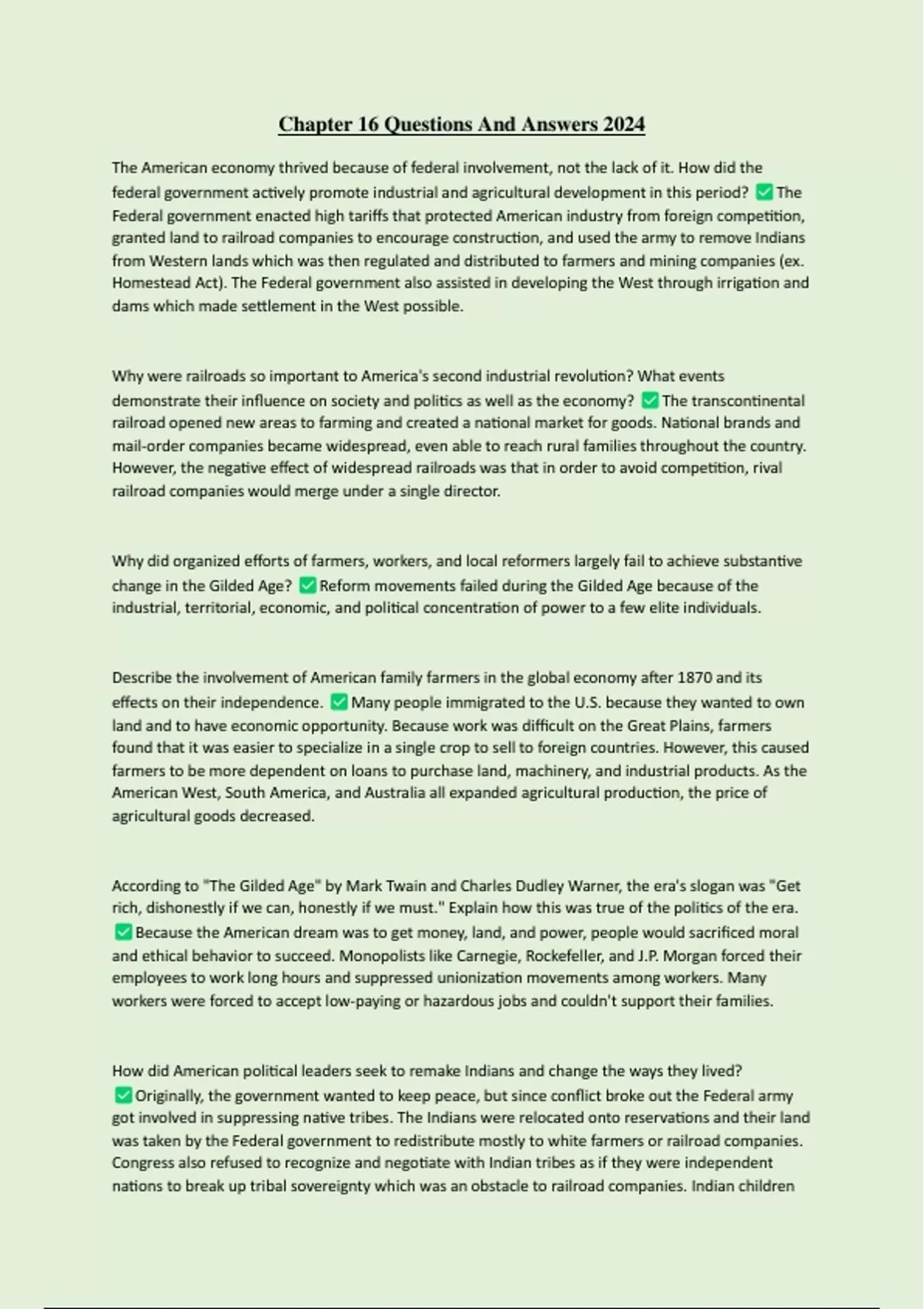 Chapter 16 Questions And Answers 2024 The American economy thrived because of federal involvement, not the lack of it. How did the federal government actively promote industrial and agricultural development in this period? The Federal government enacted high tariffs that protected American industry from foreign competition, granted land to railroad companies to encourage construction, and used the army to remove Indians from Western lands which was then regulated and distributed to farmers and mining companies (ex. Homestead Act). The Federal government also assisted in developing the West through irrigation and dams which made settlement in the West possible. Why were railroads so important to America's second industrial revolution? What events demonstrate their influence on society and politics as well as the economy? The transcontinental railroad opened new areas to farming and created a national market for goods. National brands and mail-order companies became widespread, even able to reach rural families throughout the country. However, the negative effect of widespread railroads was that in order to avoid competition, rival railroad companies would merge under a single director. Why did organized efforts of farmers, workers, and local reformers largely fail to achieve substantive change in the Gilded Age? Reform movements failed during the Gilded Age because of the industrial, territorial, economic, and political concentration of power to a few elite individuals. Describe the involvement of American family farmers in the global economy after 1870 and its effects on their independence. Many people immigrated to the U.S. because they wanted to own land and to have economic opportunity. Because work was difficult on the Great Plains, farmers found that it was easier to specialize in a single crop to sell to foreign countries. However, this caused farmers to be more dependent on loans to purchase land, machinery, and industrial products. As the American West, South America, and Australia all expanded agricultural production, the price of agricultural goods decreased. According to "The Gilded Age" by Mark Twain and Charles Dudley Warner, the era's slogan was "Get rich, dishonestly if we can, honestly if we must." Explain how this was true of the politics of the era. Because the American dream was to get money, land, and power, people would sacrificed moral and ethical behavior to succeed. Monopolists like Carnegie, Rockefeller, and J.P. Morgan forced their employees to work long hours and suppressed unionization movements among workers. Many workers were forced to accept low-paying or hazardous jobs and couldn't support their families. How did American political leaders seek to remake Indians and change the ways they lived? Originally, the government wanted to keep peace, but since conflict broke out the Federal army got involved in suppressing native tribes. The Indians were relocated onto reservations and their land was taken by the Federal government to redistribute mostly to white farmers or railroad companies. Congress also refused to recognize and negotiate with Indian tribes as if they were independent nations to break up tribal sovereignty which was an obstacle to railroad companies. Indian children were often sent to boarding schools to become "Americanized" through changing their clothes, hair, and names and educating them in "white ways." Explain how social thinkers misapplied Charles Darwin;s ideas to justify massive disparities in wealth and power and to deny governmental role in equalizing opportunity. Social Darwinists believed that industrial corporations were a "higher form of evolution" and therefore it was wrong to restrict its actions through laws that might regulate working conditions or provide public assistance to the poor. It was believed that the poor were responsible for their poverty due to lack of character and should practice personal economics rather than relying on the government. As a result, the government spent more time and energy on determining the "deserving" and the "undeserving" poor instead of actually helping the poor. How did social reformers such as Edward Bellamy, Henry George, and advocates of the social gospel conceive of liberty and freedom differently than the proponents of the liberty of contract ideal and laissez-faire? Social reformers believed liberty could not be achieved without government control because it provided equality. However, proponents of the liberty of contract ideal and laissez-faire believed liberty was attained personally, without any dependence on the government. This allowed capitalists to take advantage of workers. In what ways did the West provide a "safety valve" for the problems in the industrial East? In what ways did it reveal some of the same problems? The West provided a safety valve for those in the East who could not find work, homes, or a comfortable life because land was available and cheap. However, the economic issues followed as farmers went into debt when agricult