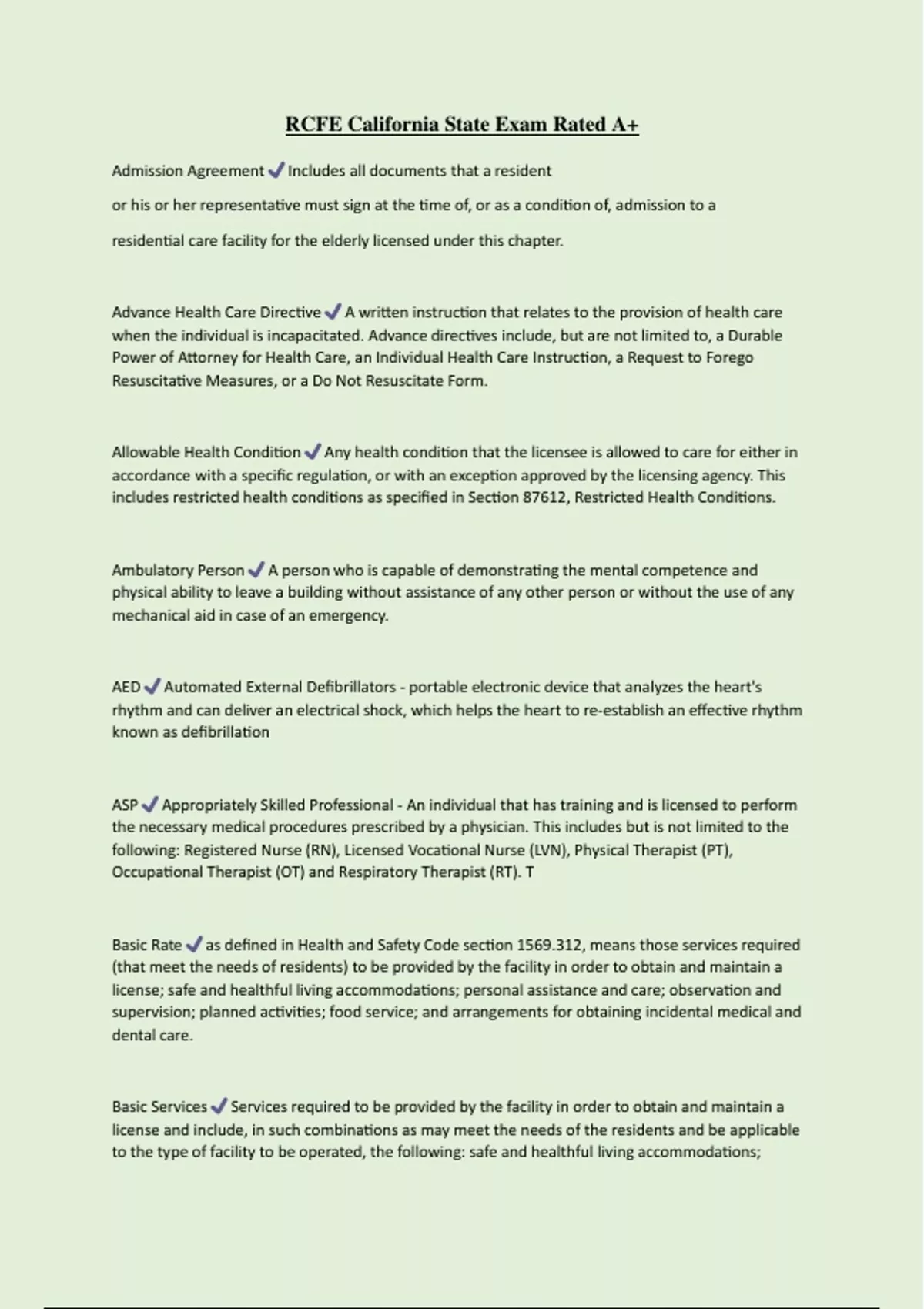 RCFE California State Exam Rated A+ Admission Agreement Includes all documents that a resident or his or her representative must sign at the time of, or as a condition of, admission to a residential care facility for the elderly licensed under this chapter. Advance Health Care Directive A written instruction that relates to the provision of health care when the individual is incapacitated. Advance directives include, but are not limited to, a Durable Power of Attorney for Health Care, an Individual Health Care Instruction, a Request to Forego Resuscitative Measures, or a Do Not Resuscitate Form. Allowable Health Condition Any health condition that the licensee is allowed to care for either in accordance with a specific regulation, or with an exception approved by the licensing agency. This includes restricted health conditions as specified in Section 87612, Restricted Health Conditions. Ambulatory Person A person who is capable of demonstrating the mental competence and physical ability to leave a building without assistance of any other person or without the use of any mechanical aid in case of an emergency. AED Automated External Defibrillators - portable electronic device that analyzes the heart's rhythm and can deliver an electrical shock, which helps the heart to re-establish an effective rhythm known as defibrillation ASP Appropriately Skilled Professional - An individual that has training and is licensed to perform the necessary medical procedures prescribed by a physician. This includes but is not limited to the following: Registered Nurse (RN), Licensed Vocational Nurse (LVN), Physical Therapist (PT), Occupational Therapist (OT) and Respiratory Therapist (RT). T Basic Rate as defined in Health and Safety Code section 1569.312, means those services required (that meet the needs of residents) to be provided by the facility in order to obtain and maintain a license; safe and healthful living accommodations; personal assistance and care; observation and supervision; planned activities; food service; and arrangements for obtaining incidental medical and dental care. Basic Services Services required to be provided by the facility in order to obtain and maintain a license and include, in such combinations as may meet the needs of the residents and be applicable to the type of facility to be operated, the following: safe and healthful living accommodations; personal assistance and care; observation and supervision; planned activities; food service; and arrangements for obtaining incidental medical and dental care. California Clearance Individual has no felony or misdemeanor convictions reported by the California Department of Justice. However, the individual may have been arrested with no criminal conviction, convicted of a minor traffic offense or adjudicated as a juvenile. Capacity Maximum number of persons authorized to be provided services at any one time in any licensed facility. Care and Supervision Activities which if provided shall require the facility to be licensed. (A) Assistance in dressing, grooming, bathing and other personal hygiene; (B) Assistance with taking medication (C) Central storing and distribution of medications & Incidental Medical and Dental Care Services; (D) Arrangement of and assistance with medical and dental care; may include transportation (E) Maintenance of house rules for the protection of residents; (F) Supervision of resident schedules and activities; (G) Maintenance and supervision of resident monies or property; (H) Monitoring food intake or special diets Certificate Holder A person who has a current administrator's certificate issued by the Department regardless of whether the person is employed as an administrator in a residential care facility for the elderly. Certified Administrator An administrator who has been issued a residential care facility for the elderly administrator certificate by the Department and whose certificate is current. Community Care Facility Any facility, place or building providing nonmedical care and supervision, as defined in Section 87101(c)(3). Conservator Person appointed by the Superior Court pursuant to Probate Code section 1800 et. seq. or Welfare and Institutions Code section 5350, to care for the person, or estate, or pe