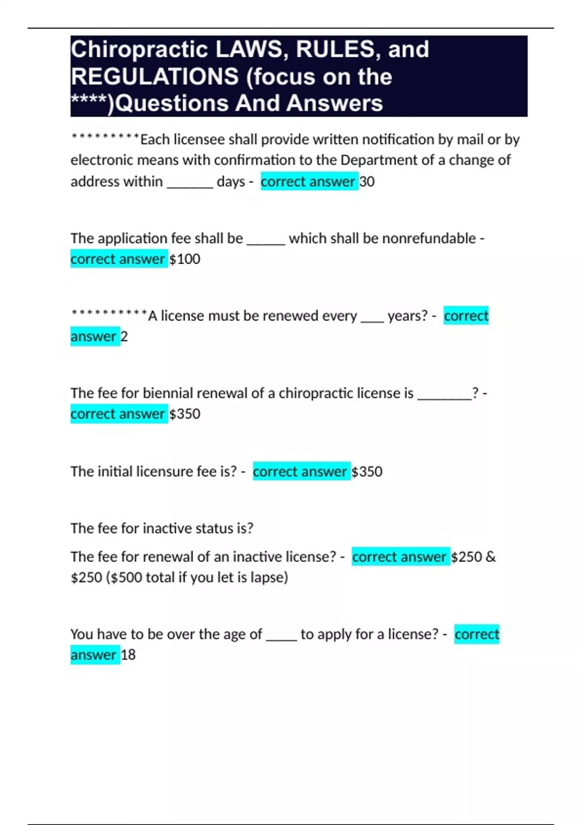 Chiropractic LAWS, RULES, and REGULATIONS (focus on the ****)Questions And Answers
