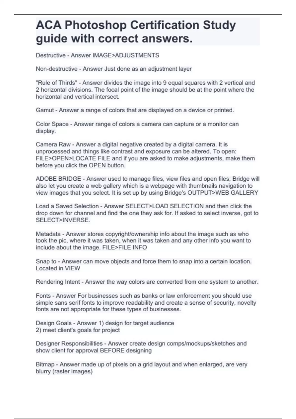 ACA Photoshop Certification Study guide with correct answers.