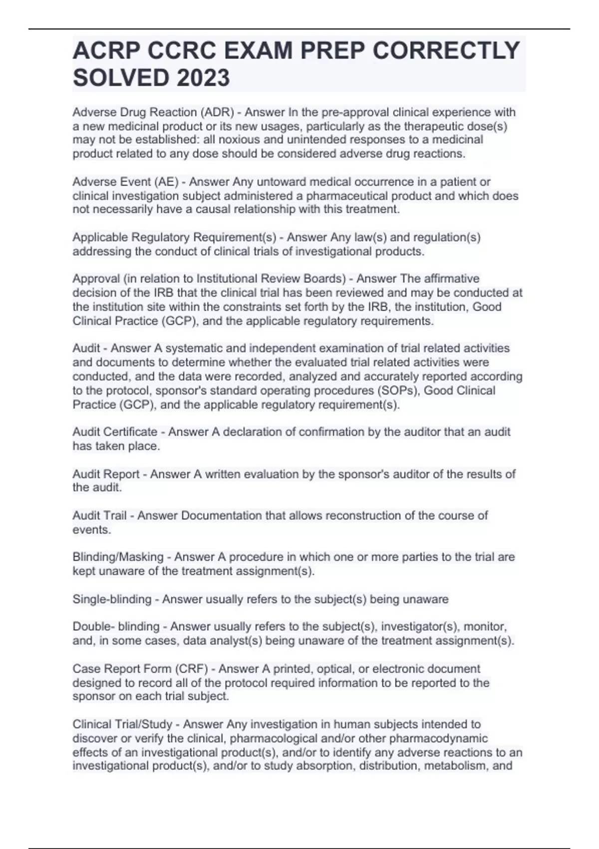 ACRP CCRC EXAM PREP CORRECTLY SOLVED 2023.