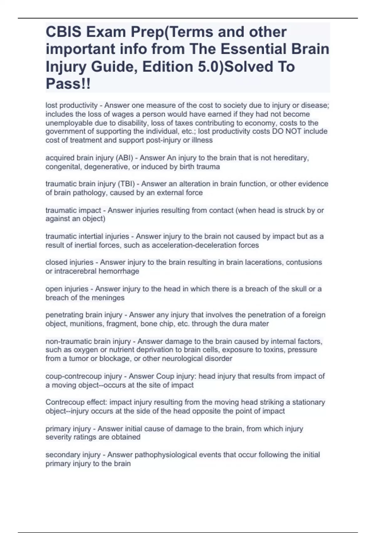CBIS Exam Prep(Terms and other important info from The Essential Brain Injury Guide, Edition 5.0)Solved