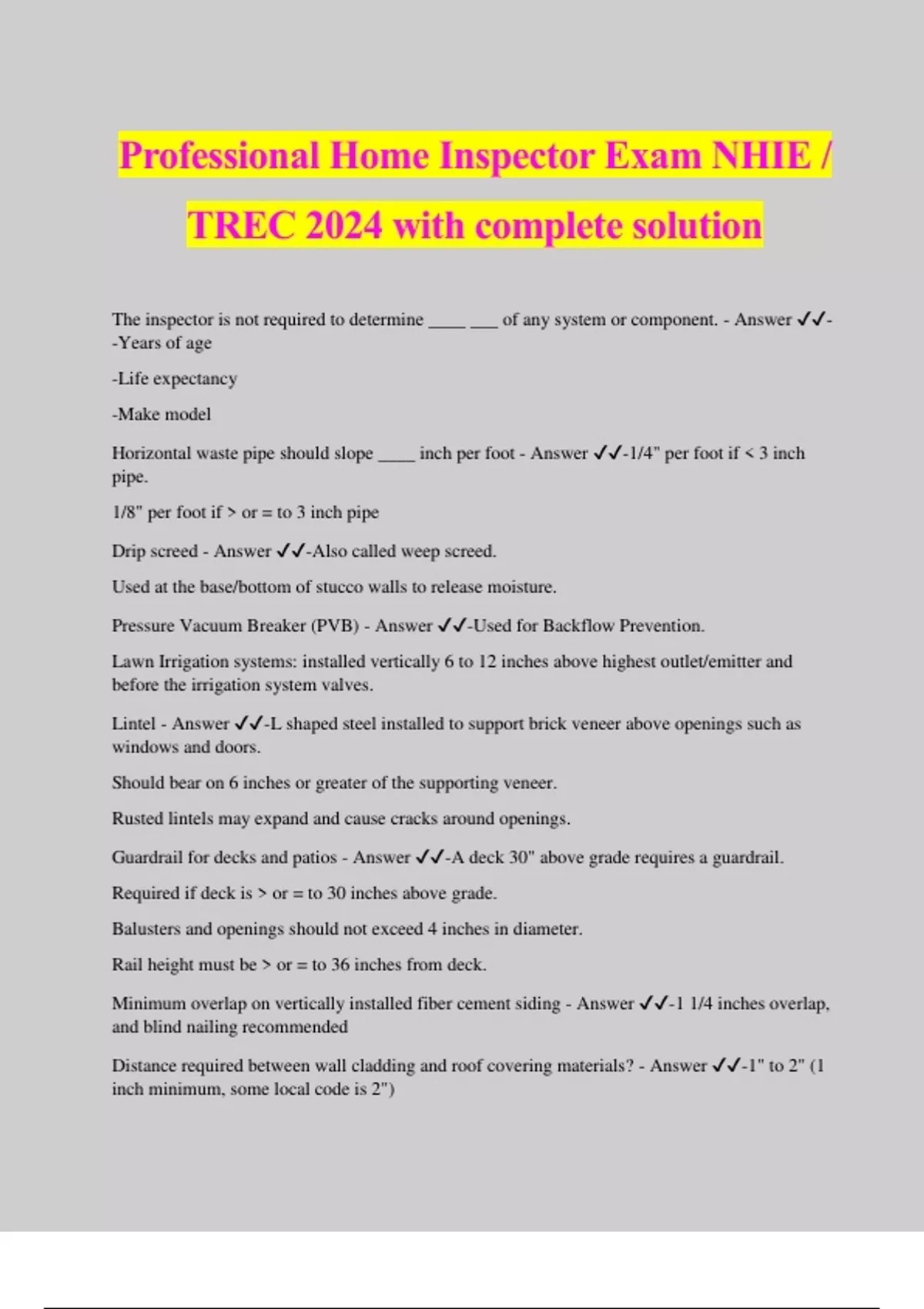 Professional Home Inspector Exam NHIE / TREC 2024 with complete solution The inspector is not required to determine ____ ___ of any system or component. - Answer ️️ - -Years of age -Life expectancy -Make model Horizontal waste pipe should slope ____ inch per foot - Answer ️️ -1/4" per foot if 3 inch pipe. 1/8" per foot if or = to 3 inch pipe Drip screed - Answer ️️ -Also called weep screed. Used at the base/bottom of stucco walls to release moisture. Pressure Vacuum Breaker (PVB) - Answer ️️ -Used for Backflow Prevention. Lawn Irrigation systems: installed vertically 6 to 12 inches above highest outlet/emitter and before the irrigation system valves. Lintel - Answer ️️ -L shaped steel installed to support brick veneer above openings such as windows and doors. Should bear on 6 inches or greater of the supporting veneer. Rusted lintels may expand and cause cracks around openings. Guardrail for decks and patios - Answer ️️ -A deck 30" above grade requires a guardrail. Required if deck is or = to 30 inches above grade. Balusters and openings should not exceed 4 inches in diameter. Rail height must be or = to 36 inches from deck. Minimum overlap on vertically installed fiber cement siding - Answer ️️ -1 1/4 inches overlap, and blind nailing recommended Distance required between wall cladding and roof covering materials? - Answer ️️ -1" to 2" (1 inch minimum, some local code is 2") What is the concern with a Double sided key lock deadbolt - Answer ️️ -All means of egress (escape), must be operable from the inside without special knowledge or tools. A keyed lock is a danger. Fiberglass shingle roof that is 5 years old is losing granular and cupping. Attic insulation and venting is adequate. What is the most reasonable explanation? - Answer ️️ -Improper installation. Sealing strip or nailing was not done properly. What is the last part to fail in a slate roof system? - Answer ️️ -The slate itself. Flashings eventually wear out, but long before the slate. Metal roof has minor rust in spots. What is the corrective action? - Answer ️️ -Removing the rust, priming and painting. What type of flashing is found on a gable edge? - Answer ️️ -Rake edge or edge flashing. A gable Edge is called a rake. Which construction framing provides fire blocking? - Answer ️️ -a platform-framed structure The Bottom chords of trusses were cut to fit other construction. What is the recommendation? - Answer ️️ -Recommend a structural engineer . What purpose does a barometric damper serve? - Answer ️️ -To control the draft Water is dripping from discharge piping coming from a hydronic heating system. What is most likely the cause? - Answer ️️ -A leak Masonry Chimney is required to be _____ inches from wood framing in the attic? - Answer ️️ - 2" When new insulation is placed directly over old in the attic, what is the correct way to place / handle Kraft paper on new insulation? - Answer ️️ -Score or remove the vapor paper What two structural components would be tied together with hurricane ties? - Answer ️️ - Truss/rafter to the top of walls What type of piping is used for a pool circulation system? - Answer ️️ -Schedule 40 PVC Does the main water supply shutoff have to be above grade, below grade, or accessible? - Answer ️️ -Accessible ? Distance between interior electrical receptacles? - Answer ️️ -12' A wood burning furnace should be how far away from combustibles - Answer ️️ -18" Dishwasher drain line is installed where in reference to the trap? - Answer ️️ -Above stairs, staircase tread depth - Answer ️️ -Tread depth should be a minimum of 10 inches. 11 inches if there is no nosing. The difference between any two riser heights, treads or nosing in a flight of stairs should be no more than 3/8ths of an inch Staircase Nosing projection - Answer ️️ -Nosing should project between 3/4th inch and 1 1/4th inch The difference between any two riser heights, treads or nosing in a flight of stairs should be no more than 3/8ths of an inch Staircase Riser height - Answer ️️ -Riser height should be 7 3/4th inches maximum The difference between any two riser heights, treads or nosing in a flight of stairs should be no more than 3/8ths of an inch Stair stringers and width - Answer ️️ -Stairs wider than 36 inches should have at least three stringers Spiral staircase - Answer ️️ -Tread depth should be a minimum of 7 1/2 inches, measured 12 inches from the narrow side. Riser height should be 9 1/2 inches maximum. Minimum width is 26 inches at / below the handrail Hearth size requirements for greater than and smaller than 6 square feet - Answer ️️ -6' opening - 16" in front and 8" sides Over 6' - 20" and 12" What is a cricket or saddle? - Answer ️️ -A ridge structure designed to divert water on a roof around the high side of a chimney or the transition from one roof area to another Deadman - Answer ️️ -any type of anchor embedded in the supported soil and tied to the retaining wall Egress window - Answer ️️ -A window large enough, as defined by local building codes, for exit or entry in case of an emergency. Typically required in bedrooms. Size: Height above floor: Which roof covering would be best for a slope of 2 inches per foot? - Answer ️️ -2:12 is minimum for asphalt. Recommend meta