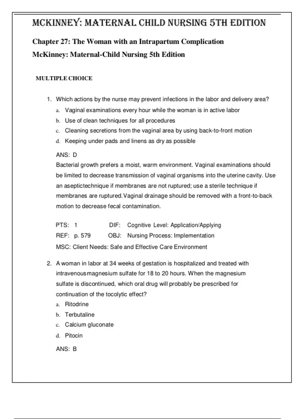 Maternal Child Nursing 5th Edition by McKinney- ISBN- 978-0323401708 TEST BANK Chapter 27: The Woman with an Intrapartum Complication Verified 2024 Practice Questions and 100% Correct Answers with Explanations for Exam Preparation, Graded A+ Which actions by the nurse may prevent infections in the labor and delivery area? a. Vaginal examinations every hour while the woman is in active labor b. Use of clean techniques for all procedures c. Cleaning secretions from the vaginal area by using back-to-front motion d. Keeping under pads and linens as dry as possible ANS: D Bacterial growth prefers a moist, warm environment. Vaginal examinations should be limited to decrease transmission of vaginal organisms into the uterine cavity. Use an aseptictechnique if membranes are not ruptured; use a sterile technique if membranes are ruptured.Vaginal drainage should be removed with a front-to-back motion to decrease fecal contamination. PTS: 1 DIF: Cognitive Level: Application/Applying REF: p. 579 OBJ: Nursing Process: Implementation MSC: Client Needs: Safe and Effective Care Environment 2. A woman in labor at 34 weeks of gestation is hospitalized and treated with intravenousmagnesium sulfate for 18 to 20 hours. When the magnesium sulfate is discontinued, which oral drug will probably be prescribed for continuation of the tocolytic effect? a. Ritodrine b. Terbutaline c. Calcium gluconate d. Pitocin ANS: B The woman receiving decreasing doses of magnesium sulfate is often switched to oral terbutaline to maintain tocolysis for 48 hours. The terbutaline will probably be discontinuedprior to discharge. Ritodrine is the only drug approved by the FDA for tocolysis; however, itis rarely used because of significant side effects. Calcium gluconate reverses magnesium sulfate toxicity. The drug should be available for complications of magnesium sulfate therapy. Pitocin is used to augment labor, not stop it. PTS: 1 DIF: Cognitive Level: Knowledge/Remembering REF: p. 588 OBJ: Nursing Process: Planning MSC: Client Needs: Physiologic Integrity