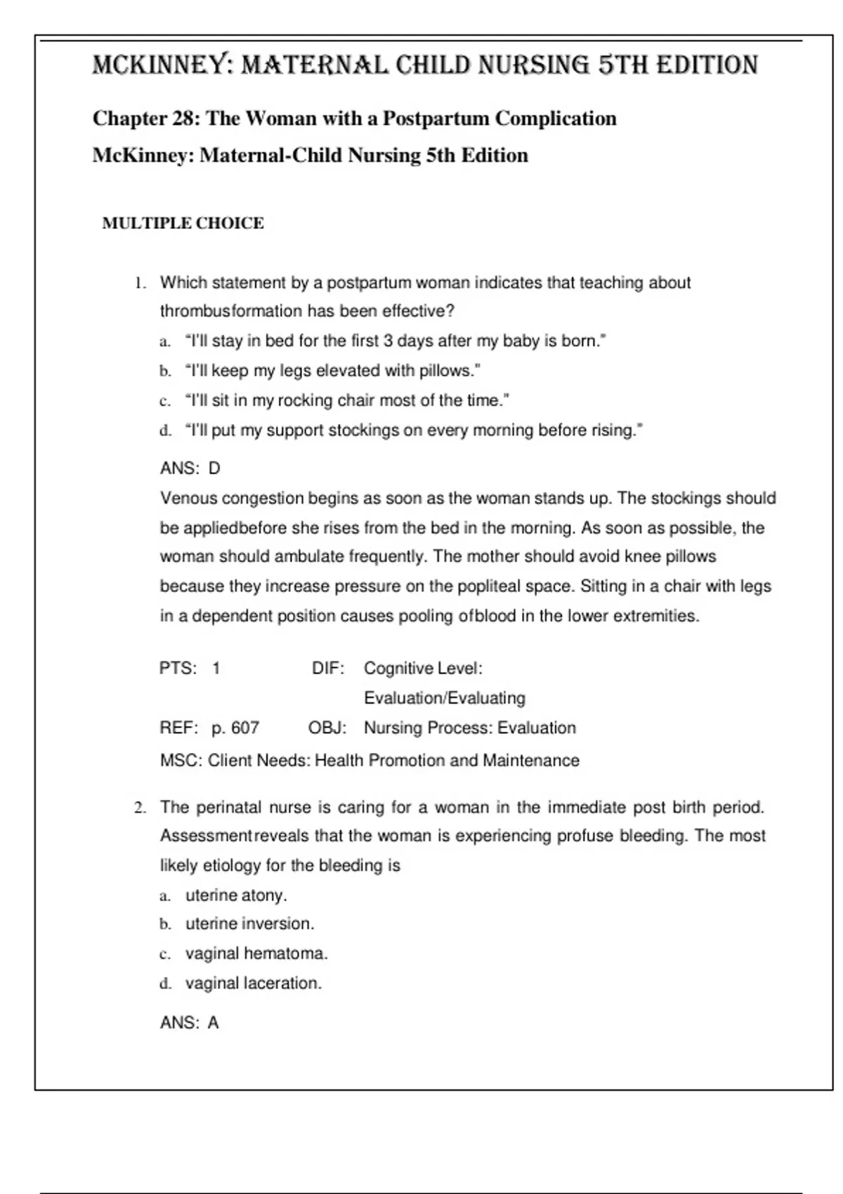 Maternal Child Nursing 5th Edition by McKinney- ISBN- 978-0323401708 TEST BANK Chapter 28: The Woman with a Postpartum Complication Verified 2024 Practice Questions and 100% Correct Answers with Explanations for Exam Preparation, Graded A+ Which statement by a postpartum woman indicates that teaching about thrombusformation has been effective? a. “I’ll stay in bed for the first 3 days after my baby is born.” b. “I’ll keep my legs elevated with pillows.” c. “I’ll sit in my rocking chair most of the time.” d. “I’ll put my support stockings on every morning before rising.” ANS: D Venous congestion begins as soon as the woman stands up. The stockings should be appliedbefore she rises from the bed in the morning. As soon as possible, the woman should ambulate frequently. The mother should avoid knee pillows because they increase pressure on the popliteal space. Sitting in a chair with legs in a dependent position causes pooling ofblood in the lower extremities. PTS: 1 DIF: Cognitive Level: Evaluation/Evaluating REF: p. 607 OBJ: Nursing Process: Evaluation MSC: Client Needs: Health Promotion and Maintenance 2. The perinatal nurse is caring for a woman in the immediate post birth period. Assessmentreveals that the woman is experiencing profuse bleeding. The most likely etiology for the bleeding is a. uterine atony. b. uterine inversion. c. vaginal hematoma. d. vaginal laceration. ANS: A Uterine atony is marked hypotonia of the uterus. It is the leading cause of postpartum hemorrhage. The other situations can cause bleeding but are not the most common cause. PTS: 1 DIF: Cognitive Level: Knowledge/Remembering REF: p. 599 OBJ: Nursing Process: Assessment MSC: Client Needs: Physiologic Integrity