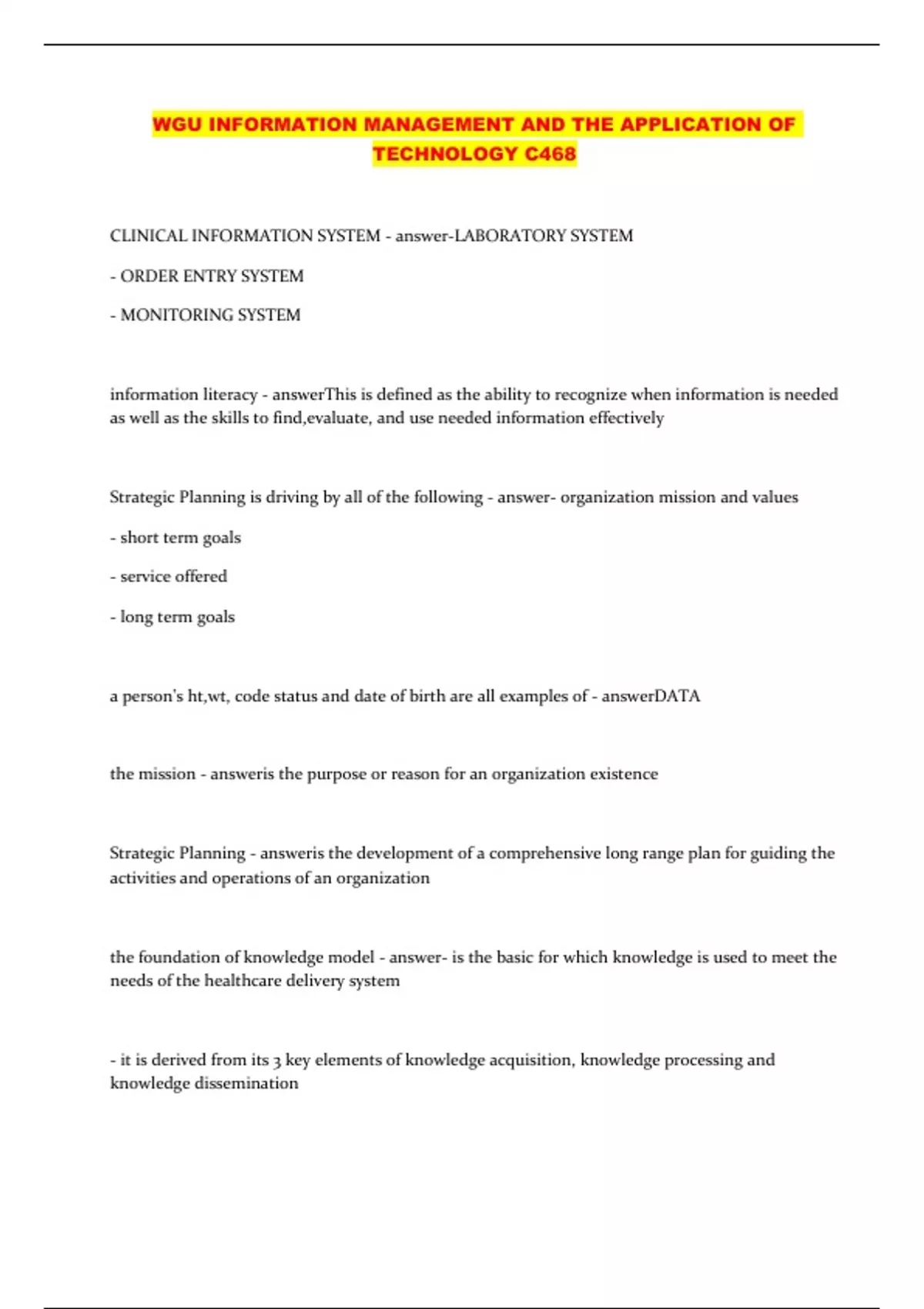CLINICAL INFORMATION SYSTEM - answer-LABORATORY SYSTEM - ORDER ENTRY SYSTEM - MONITORING SYSTEM information literacy - answerThis is defined as the ability to recognize when information is needed as well as the skills to find,evaluate, and use needed information effectively Strategic Planning is driving by all of the following - answer- organization mission and values - short term goals - service offered - long term goals