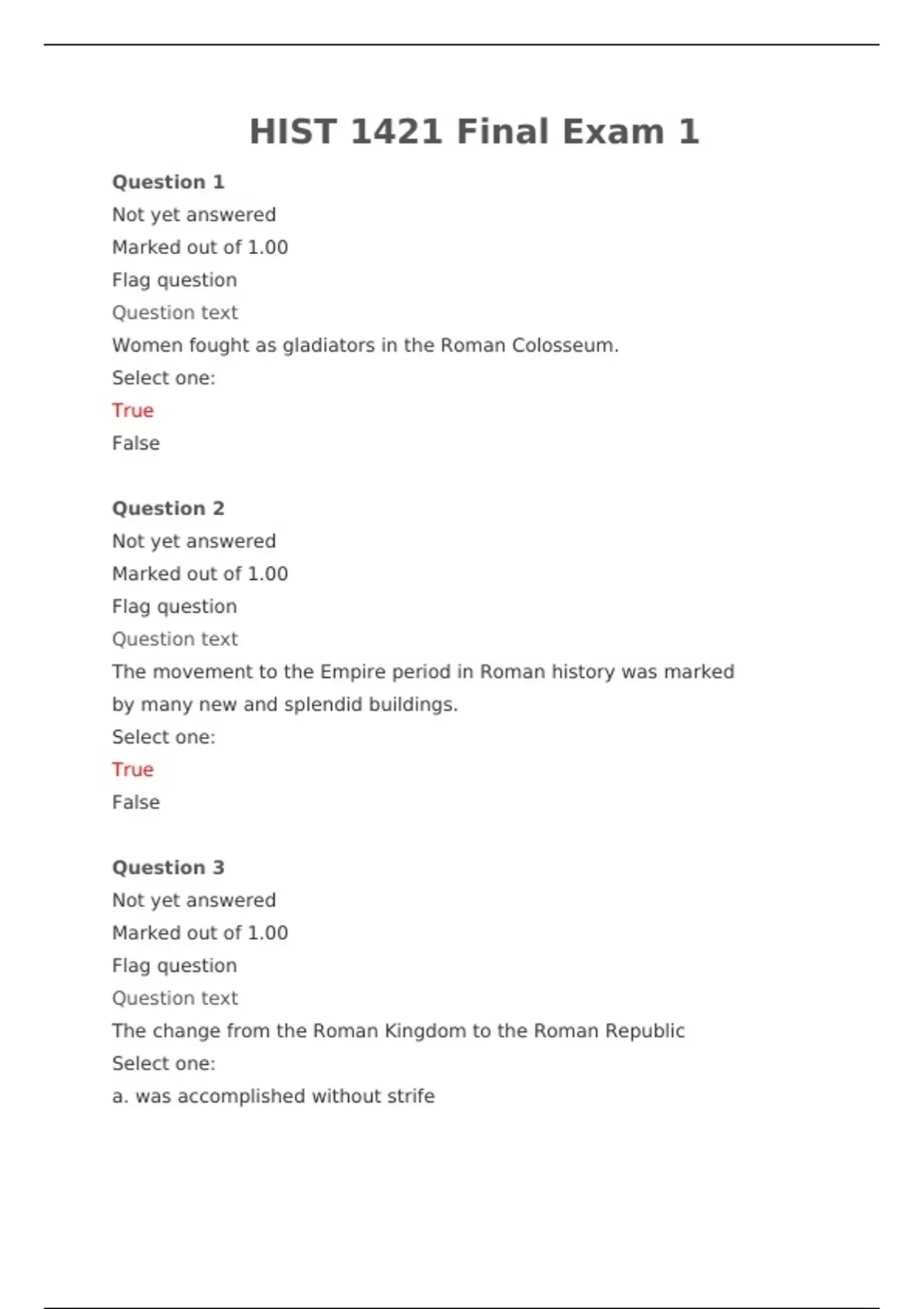 HIST 1421 Final Exam 1.Question 1 Not yet answered Marked out of 1.00 Flag question Question text Women fought as gladiators in the Roman Colosseum. Select one: True False Question 2 Not yet answered Marked out of 1.00 Flag question Question text The movement to the Empire period in Roman history was marked by many new and splendid buildings. Select one: True False Question 3 Not yet answered Marked out of 1.00 Flag question Question text The change from the Roman Kingdom to the Roman Republic Select one: a. was accomplished without strife