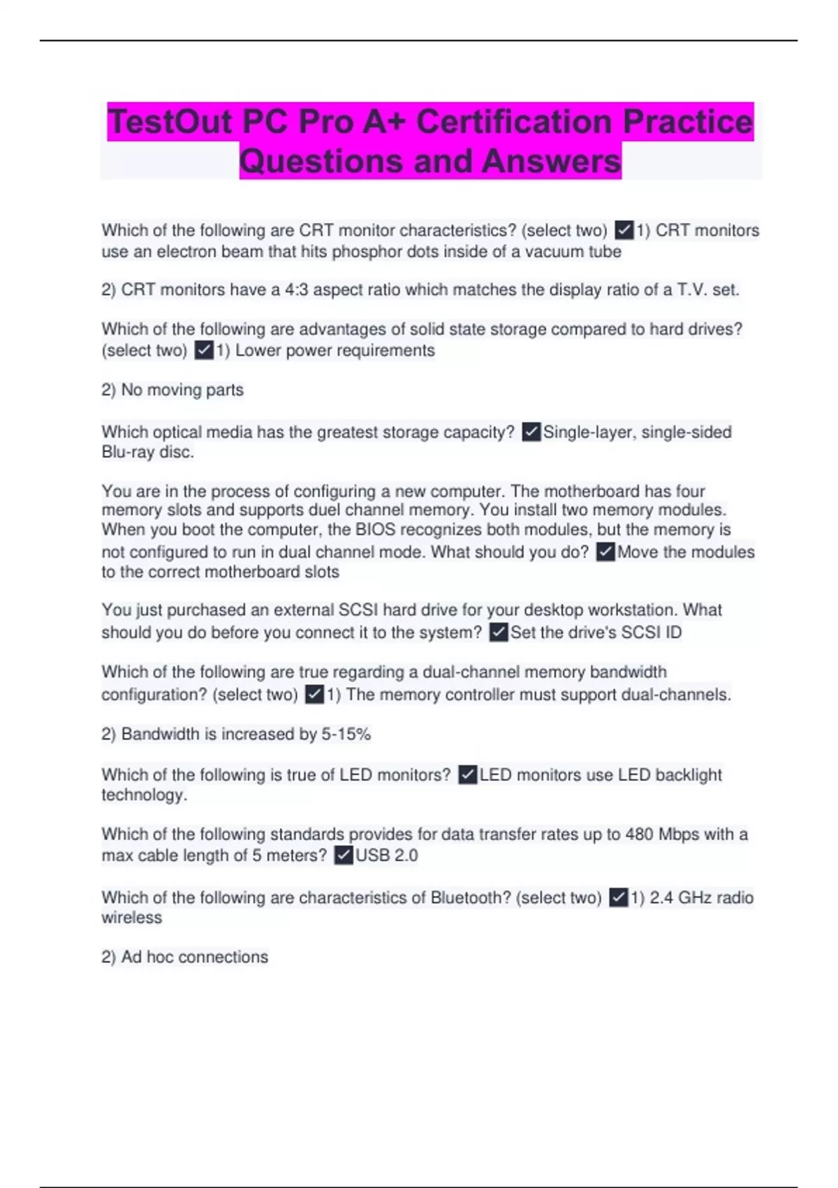 Which of the following are CRT monitor characteristics? (select two) 1) CRT monitors use an electron beam that hits phosphor dots inside of a vacuum tube 2) CRT monitors have a 4:3 aspect ratio which matches the display ratio of a T.V. set. Which of the following are advantages of solid state storage compared to hard drives? (select two) 1) Lower power requirements 2) No moving parts Which optical media has the greatest storage capacity? Single-layer, single-sided Blu-ray disc. You are in the process of configuring a new computer. The motherboard has four memory slots and supports duel channel memory. You install two memory modules. When you boot the computer, the BIOS recognizes both modules, but the memory is not configured to run in dual channel mode. What should you do? Move the modules to the correct motherboard slots You just purchased an external SCSI hard drive for your desktop workstation. What should you do before you connect it to the system? Set the drive's SCSI ID Which of the following are true regarding a dual-channel memory bandwidth configuration? (select two) 1) The memory controller must support dual-channels. 2) Bandwidth is increased by 5-15% Which of the following is true of LED monitors? LED monitors use LED backlight technology.