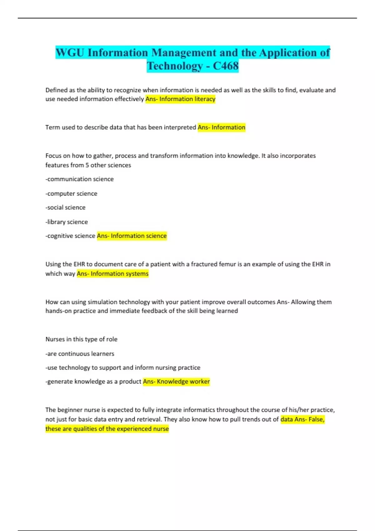Defined as the ability to recognize when information is needed as well as the skills to find, evaluate and use needed information effectively Ans- Information literacy Term used to describe data that has been interpreted Ans- Information Focus on how to gather, process and transform information into knowledge. It also incorporates features from 5 other sciences -communication science -computer science -social science -library science -cognitive science Ans- Information science Using the EHR to document care of a patient with a fractured femur is an example of using the EHR in which way Ans- Information systems How can using simulation technology with your patient improve overall outcomes Ans- Allowing them hands-on practice and immediate feedback of the skill being learned Nurses in this type of role -are continuous learners -use technology to support and inform nursing practice -generate knowledge as a product Ans- Knowledge worker The beginner nurse is expected to fully integrate informatics throughout the course of his/her practice, not just for basic data entry and retrieval. They also know how to pull trends out of data Ans- False, these are qualities of the exp