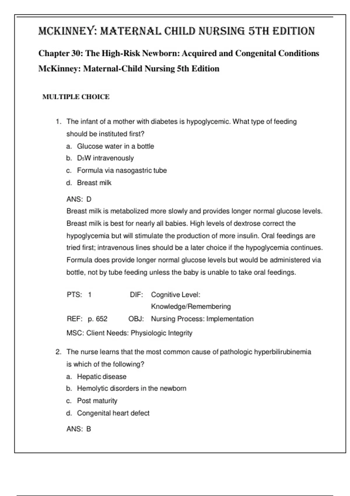 Maternal Child Nursing 5th Edition by McKinney- ISBN- 978-0323401708 TEST BANK Chapter 30: The High-Risk Newborn: Acquired and Congenital Conditions Verified 2024 Practice Questions and 100% Correct Answers with Explanations for Exam Preparation, Graded A+ The infant of a mother with diabetes is hypoglycemic. What type of feeding should be instituted first? a. Glucose water in a bottle b. D5W intravenously c. Formula via nasogastric tube d. Breast milk ANS: D Breast milk is metabolized more slowly and provides longer normal glucose levels. Breast milk is best for nearly all babies. High levels of dextrose correct the hypoglycemia but will stimulate the production of more insulin. Oral feedings are tried first; intravenous lines should be a later choice if the hypoglycemia continues. Formula does provide longer normal glucose levels but would be administered via bottle, not by tube feeding unless the baby is unable to take oral feedings. PTS: 1 DIF: Cognitive Level: Knowledge/Remembering REF: p. 652 OBJ: Nursing Process: Implementation MSC: Client Needs: Physiologic Integrity 2. The nurse learns that the most common cause of pathologic hyperbilirubinemia is which of the following? a. Hepatic disease b. Hemolytic disorders in the newborn c. Post maturity d. Congenital heart defect ANS: B Hemolytic disorders in the newborn are the most common cause of pathologic jaundice. Hepatic damage and prematurity may be causes of pathologic hyperbilirubinemia, but they are not the most common cause. Congenital heart defect is not a common cause of pathologic hyperbilirubinemia in neonates. PTS: 1 DIF: Cognitive Level: Knowledge/Remembering REF: p. 645 OBJ: Integrated Process: Teaching-Learning MSC: Client Needs: Physiologic Integrity
