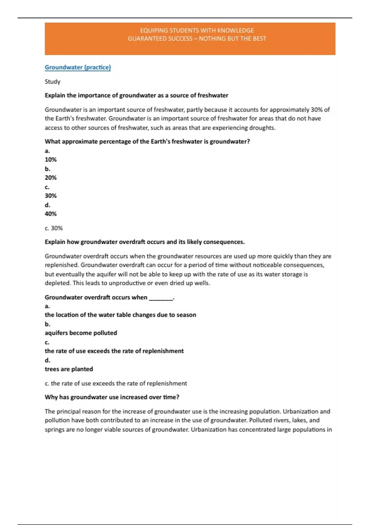 Explain the importance of groundwater as a source of freshwater Groundwater is an important source of freshwater, partly because it accounts for approximately 30% of the Earth's freshwater. Groundwater is an important source of freshwater for areas that do not have access to other sources of freshwater, such as areas that are experiencing droughts. What approximate percentage of the Earth's freshwater is groundwater? a. 10% b. 20% c. 30% d. 40% c. 30% Explain how groundwater overdraft occurs and its likely consequences. Groundwater overdraft occurs when the groundwater resources are used up more quickly than they are replenished. Groundwater overdraft can occur for a period of time without noticeable consequences, but eventually the aquifer will not be able to keep up with the rate of use as its water storage is depleted. This leads to unproductive or even dried up wells. Groundwater overdraft occurs when _______. a. the location of the water table changes due to season b. aquifers become polluted c. the rate of use exceeds the rate of replenishment d. trees are planted c. the rate of use exceeds the rate of replenishment Why has groundwater use increased over time? The principal reason for the increase of groundwater use is the increasing population. Urbanization and pollution have both contributed to an increase in the use of groundwater. Polluted rivers, lakes, and springs are no longer viable sources of groundwater. Urbanization has concentrated large populations in