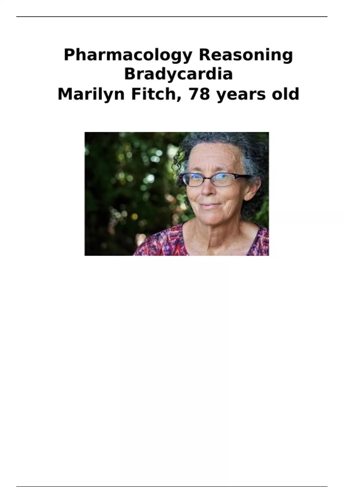 Pharmacology Reasoning Bradycardia I. Initial Presentation: Marilyn Fitch is a 78-year-old Caucasian woman with a history of hypercholesteremia, hypertension, and heart failure and has NKDA. She was brought in by her daughter after Marilyn complained of feeling dizzy several times this morning and then almost passed out at home. Marilyn has a six-month history of paroxysmal atrial fibrillation. Her heart rate has been regular and she has had no episodic dizziness since she had a synchronized cardioversion one week prior to this visit. Her initial VS in triage were: T: 98.9 F/37.2 C (oral) P: 52 R: 16 BP: 94/52 and O2 sat: 98% room air. Personal/Social History: Marilyn is a widow and lives alone in her own home. She denies smoking and admits to drinking one glass of wine with her dinner. 1. What data from the histories are RELEVANT and must be NOTICED as clinically significant by the nurse? (NCSBN: Step 1 Recognize cues/NCLEX: Reduction of Risk Potential) RELEVANT Data from Present Problem: Clinical Significance: • Hypercholesterolemia Hypertension Heart failure • Dizziness/ almost passing out • 6-month paroxysmal A fib • Synchronized cardioversion • Pulse of 52, BP 94/52 • All of these are risk factors (especially when combined) for heart attack and stroke • Concerning signs of heart rhythm changes • Vitals of low HR and Low BP, usually if one of these two vitals changes, the other will increase to compensate. RELEVANT Data from Social History: Clinical Significance: • Widow and lives alone • Drinking wine with dinner • Shows the pt doesn’t have much of a support system, and there could be psychosocial aspects to include in her care • Drinking 1 glass of wine with dinner is usually ok, in a healthy individual. Since she has heart problems, cholesterol issues and hypertension, she should restrict alcohol use. 2. What is the RELATIONSHIP of the past medical history and current medications? Why is your patient receiving these medications? (Which medication treats which condition? Draw lines to connect) Medical History (PMH): Home Medications: Hypercholesteremia Apixaban 2.5 mg po bid Hypertension Captopril 100 mg po BID daily Heart failure Amiodarone 100 mg po bid Atrial fibrillation Hydrochlorothiazide 50 mg po daily Atorvastatin 10 mg po daily Carvedilol 6.25 mg po bid