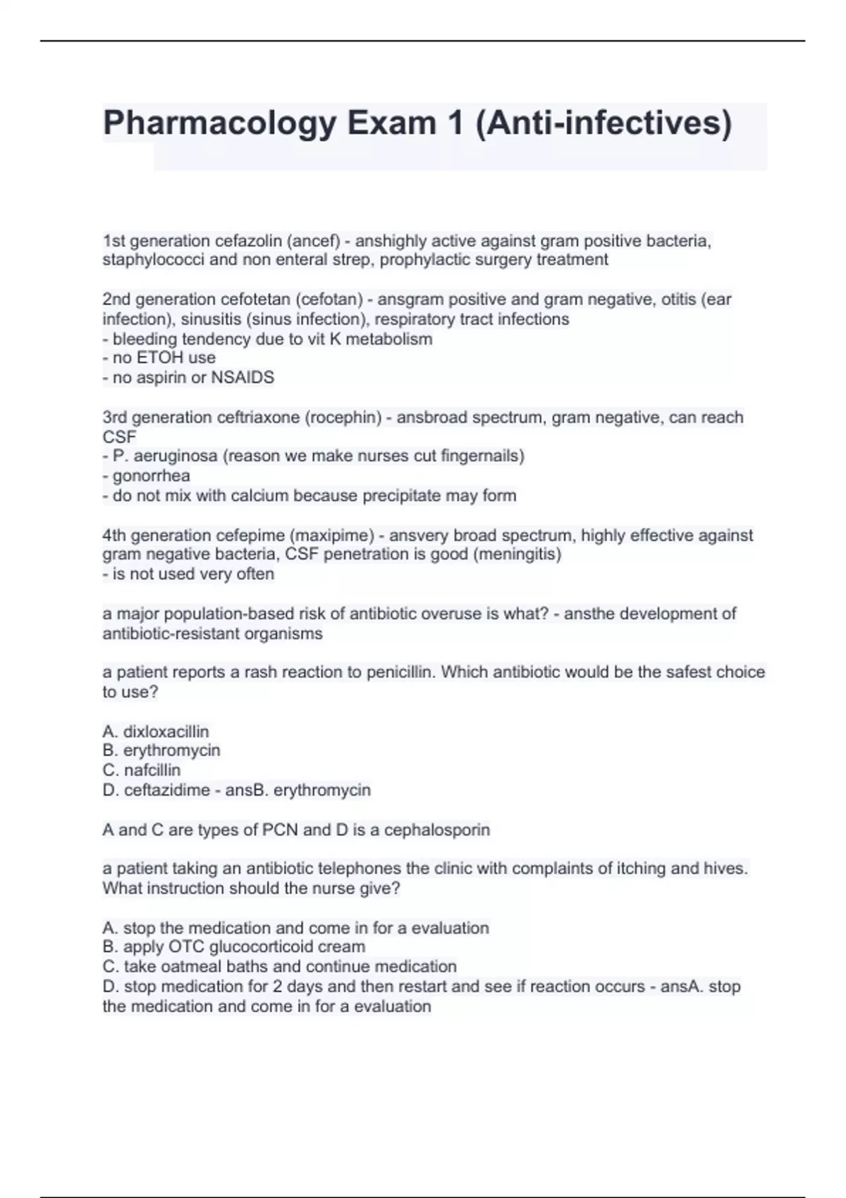 1st generation cefazolin (ancef) - anshighly active against gram positive bacteria, staphylococci and non enteral strep, prophylactic surgery treatment 2nd generation cefotetan (cefotan) - ansgram positive and gram negative, otitis (ear infection), sinusitis (sinus infection), respiratory tract infections - bleeding tendency due to vit K metabolism - no ETOH use - no aspirin or NSAIDS