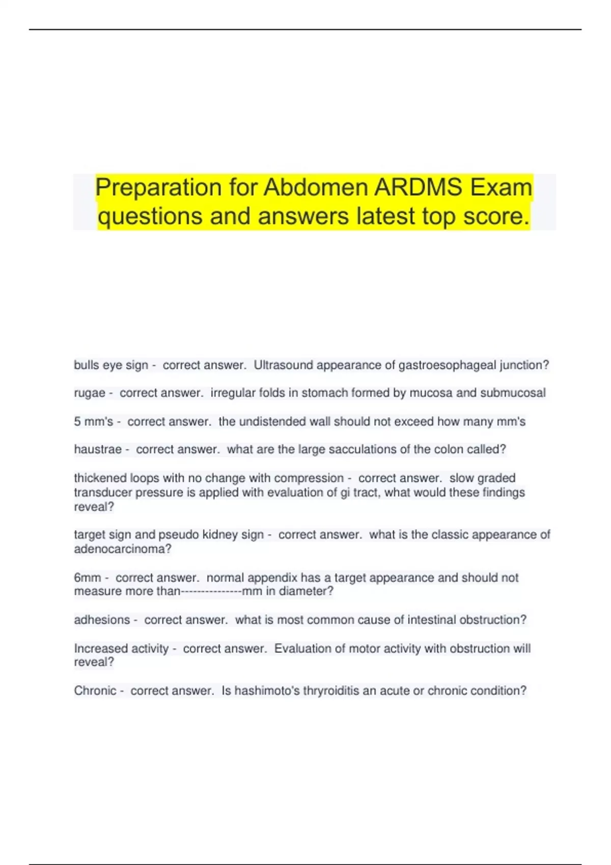 Preparation for Abdomen ARDMS Exam questions and answers latest top score.