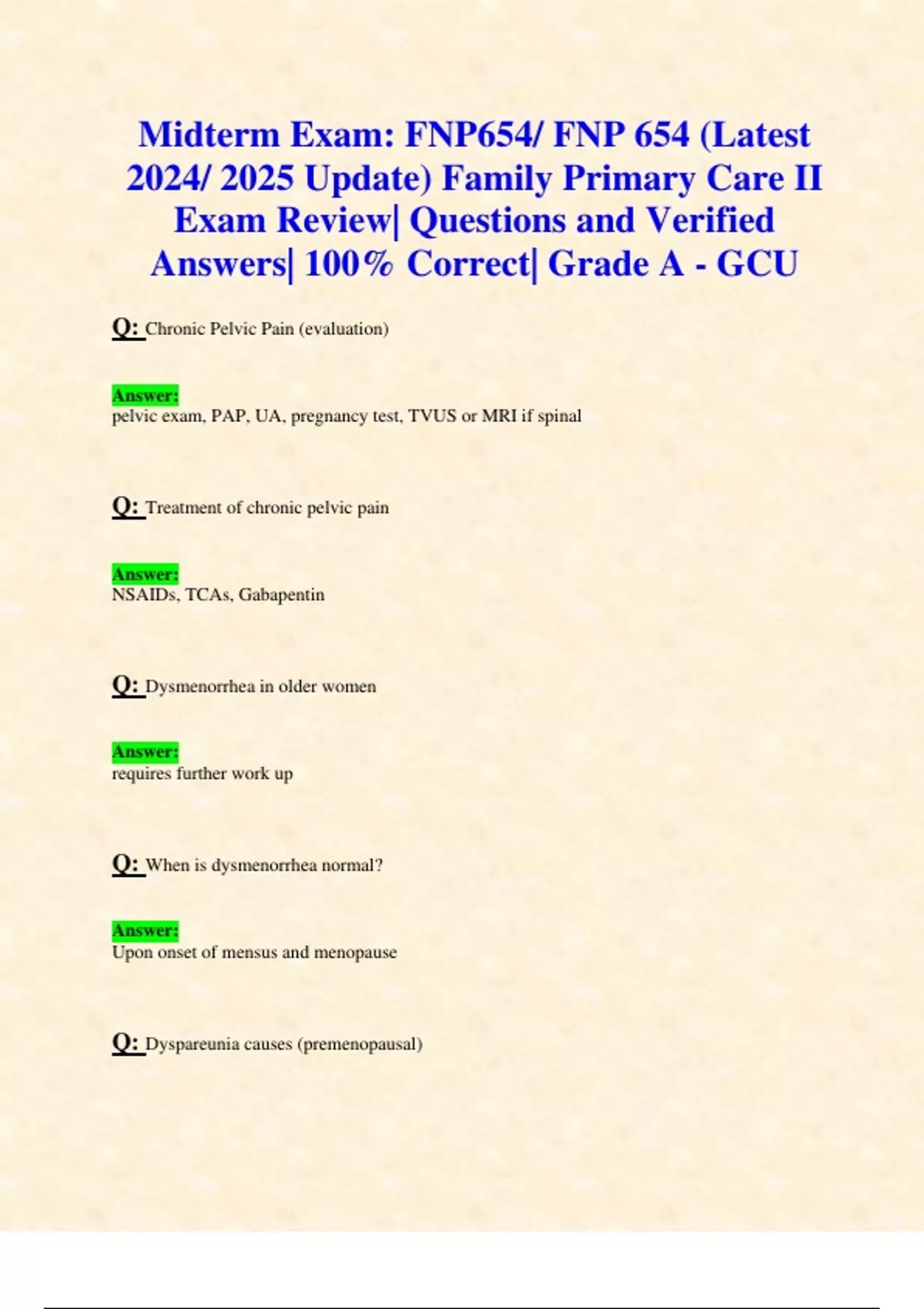 Midterm Exam: FNP654/ FNP 654 (Latest 2024/ 2025 Update) Family Primary Care II Exam Review| Questions and Verified Answers| 100% Correct| Grade A - GCU Q: Chronic Pelvic Pain (evaluation) pelvic exam, PAP, UA, pregnancy test, TVUS or MRI if spinal Q: Treatment of chronic pelvic pain Answer: NSAIDs, TCAs, Gabapentin Q: Dysmenorrhea in older women Answer: requires further work up Q: When is dysmenorrhea normal? Answer: Upon onset of mensus and menopause Q: Dyspareunia causes (premenopausal) Answer: endometriosis, trauma Q: Dyspareunia causes (post menopausal) Answer: decreased estrogen and after breast cancer due to meds Q: Abnormal PAP management Answer: Bethesda System CIN 1: conservative, surveillance CIN 2 - 3: treatment Hx of CIN 2-3: continue screening after age 65 Q: PAP recommendations based on age Answer: < 21 No PAP 21-29 every 3 years 30-65 PAP with HPV > 65 No PAP if no risk Q: Pelvic Inflammatory Disease (presentation) Answer: May be symptomatic , may not. Depending on pathogen Q: Common symptoms of PID lower abdominal pain (dull / constant), T > 38.3, discharge, elevated WBC, ESR and CRP