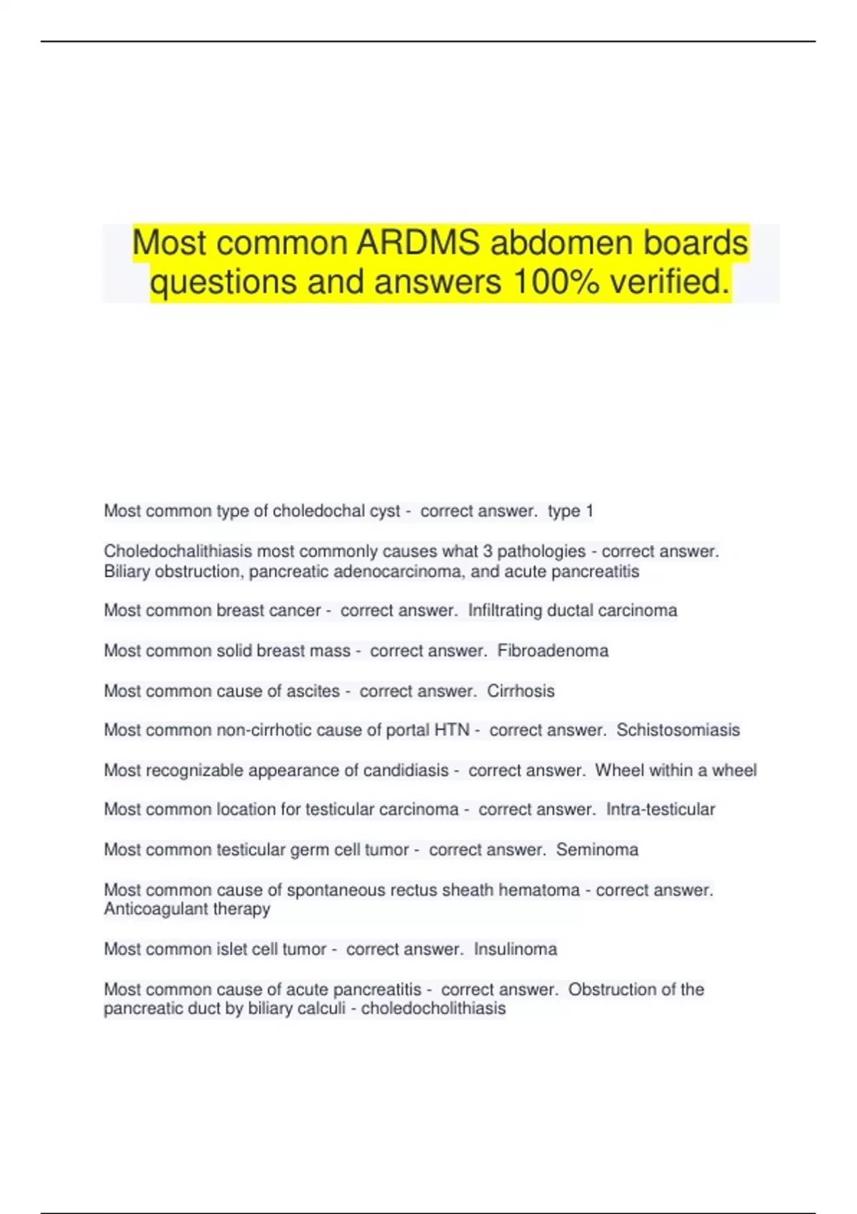 Most common ARDMS abdomen boards questions and answers 100% verified. Most common type of choledochal cyst - correct answer. type 1 Choledochalithiasis most commonly causes what 3 pathologies - correct answer. Biliary obstruction, pancreatic adenocarcinoma, and acute pancreatitis Most common breast cancer - correct answer. Infiltrating ductal carcinoma Most common solid breast mass - correct answer. Fibroadenoma Most common cause of ascites - correct answer. Cirrhosis Most common non-cirrhotic cause of portal HTN - correct answer. Schistosomiasis Most recognizable appearance of candidiasis - correct answer. Wheel within a wheel Most common location for testicular carcinoma - correct answer. Intra-testicular Most common testicular germ cell tumor - correct answer. Seminoma Most common cause of spontaneous rectus sheath hematoma - correct answer. Anticoagulant therapy Most common islet cell tumor - correct answer. Insulinoma Most common cause of acute pancreatitis - correct answer. Obstruction of the pancreatic duct by biliary calculi - choledocholithiasis Most common thyroid malignancy - correct answer. Papillary cancer Most common indication for a renal art study - correct answer. Uncontrolled HTN Most common location for obstructing calculus - correct answer. UVJ Most common cause for rejection in a transplant kidney - correct answer. Acute Tubular Necrosis Most common 2 cause of death due to cancer - correct answer. 1. Lung 2. Colon Most common type of HTN - correct answer. Intrahepatic - cirrhosis Most common portosystem collateral seen in portal HTN - correct answer. Coronary vein aka left gastric Most common cause of intra-hepatic portal HTN in the US - correct answer. Cirrhosis Most common form of malignant disease in the liver - correct answer. Metastasis Most common primary hepatic neoplasm - correct answer. HCC Vessels more commonly invaded in HCC - correct answer. Portal veins Most common cause of cirrhosis - correct answer. Hep C Most common cause for liver tx in adults? Children? - correct answer. Hep C, in kids - biliary atresia Most common extra-intestinal complication of amoebic dysentery - correct answer. Amoebic abscess Most common fungal renal disease - correct answer. Candida Popular parasitic infection in humans - correct answer. Schistosomiasis Most common organism causing infection in AIDS pts - correct answer. Pneumocystitis carinii 2nd most common benign liver mass - correct answer. Focal Nodular Hyperplasia Common neoplasm seen in AIDS pts - correct answer. Kaposi's Sarcoma Most common intra-hepatic cause of cholestasis - correct answer. Hepatitis Abscess most commonly found outside the US - correct answer. Amoebic Abscess commonly found in immunocomprised pts - correct answer. Fungal Common complication found in ducts of AIDS pts - correct answer. Cholangitis Emphysematous cholecystitis is commonly found in these two groups of pts - correct answer. Men and diabetics Most common cause of acute cholecystitis - correct answer. stone lodged in cystic duct or GB neck Most common variant of the GB - correct answer. Folds Most common location for a varicocele - correct answer. Left side Commonly seen with epididymitis and orchitis - correct answer. Large, reactive hydrocele Most common cause of acute renal failure - correct answer. Acute Tubular Necrosis Most common bladder neoplasm - correct answer. TCC, seen more often in men Most common symptom associated with TCC - correct answer. Visible hematuria Most common solid renal mass in an adult - correct answer. RCC, seen in men age 50-70 Most common childhood renal tumor - correct answer. Wilm's Tumor aka Nephroblastoma Most common malignant tumor of the pancreas - correct answer. Adenocarcinoma Most common visceral artery aneurysm - correct answer. Splenic artery aneurysm, pregnant women Most commonly associated with horseshoe kidney - correct answer. UPJ obstruction Most common cause of urinary obstruction in infants - correct answer. PUV Most common cause of diabetes mellitus - correct answer. Chronic renal failure Most common cause of abdominal mass in newborn - correct answer. MCKD Most common cause of Renal Papillary Necrosis - correct answer. Analgesic abuse Most common bacteria causing Emphysematous Cholecystitis - correct answer. e. Coli Type of pyelo seen more often in diabetics and immunocompromised pts - correct answer. Emphysematous Staghorn calculus is commonly associated with - correct answer. Xanthogranulomatous pyleo Most common cause of fungal UTI - correct answer. Candida Most common cause of pediatric congenital hydro - correct answer. UPJ obstruction Most common cause of Medullary Nephrocalcinosis - correct answer. Medullary Sponge Kidney Most common site for distal met from RCC - correct answer. Lungs Most common associated conditions at risk for RCC - correct answer. Von Hippel Lindau, pts undergoing dialysis with acquired cystic kidney disease, Tuberous Sclerosis, and ADPKD Most common anastomotic connection of a renal allograft - correct answer. External iliac Most common cause of chronic renal failure - correct answer. Chronic Glomerular Nephritis Most common cause of acute pyelo - correct answer. e. Coli Most common sites for enlarged LNs - correct answer. Para-aortic, para-caval, renal hilum, peri-pancreatic, and mesenteric Types of surgeries that commonly are associated with lymphoceles - correct answer. Renal tx, GYN surgery, and urologic Most common cause of hydroureter - correct answer. BPH Most common congenital neck cyst - correct answer. Thyroglossal duct cyst Most common site of chronic prostatis - correct answer. Peripheral zone Fetal lobulation is common in this kidney - correct answer. Right kidney Dromedary hump is commonly seen in this location - correct answer. Lateral left kidney