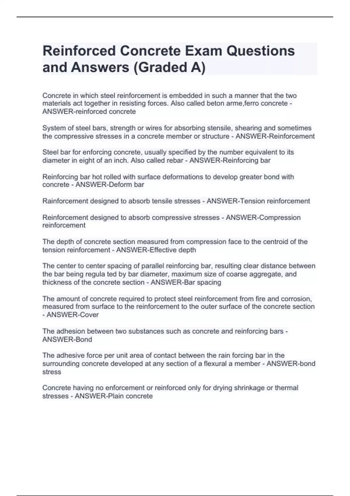 Reinforced Concrete Exam Questions and Answers (Graded A)Reinforced Concrete Exam Questions and Answers (Graded A)Reinforced Concrete Exam Questions and Answers (Graded A)Reinforced Concrete Exam Questions and Answers (Graded A) Concrete in which steel reinforcement is embedded in such a manner that the two materials act together in resisting forces. Also called beton arme,ferro concrete - ANSWER-reinforced concrete System of steel bars, strength or wires for absorbing stensile, shearing and sometimes the compressive stresses in a concrete member or structure - ANSWER-Reinforcement Steel bar for enforcing concrete, usually specified by the number equivalent to its diameter in eight of an inch. Also called rebar - ANSWER-Reinforcing bar Reinforcing bar hot rolled with surface deformations to develop greater bond with
