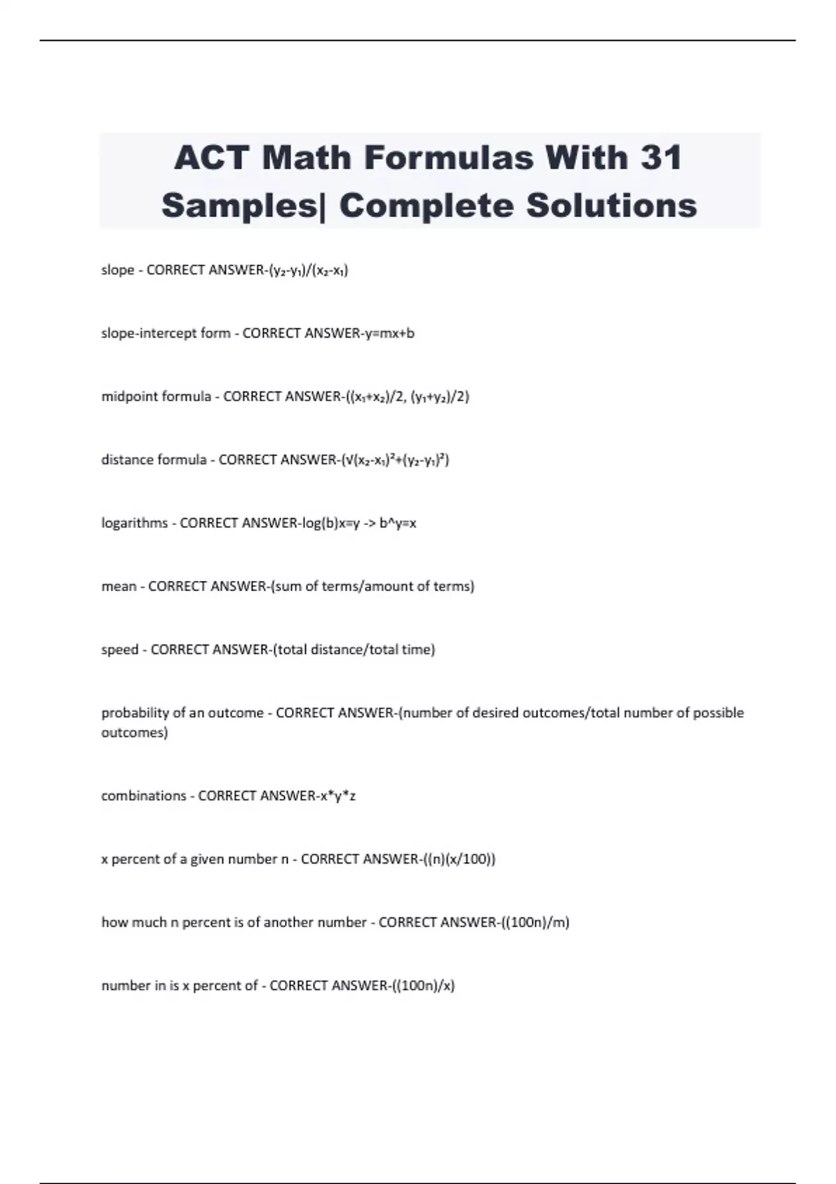 ACT Math Formulas With 31 Samples| Complete Solutions slope - CORRECT ANSWER-(y₂-y₁)/(x₂-x₁) slope-intercept form - CORRECT ANSWER-y=mx+b midpoint formula - CORRECT ANSWER-((x₁+x₂)/2, (y₁+y₂)/2)