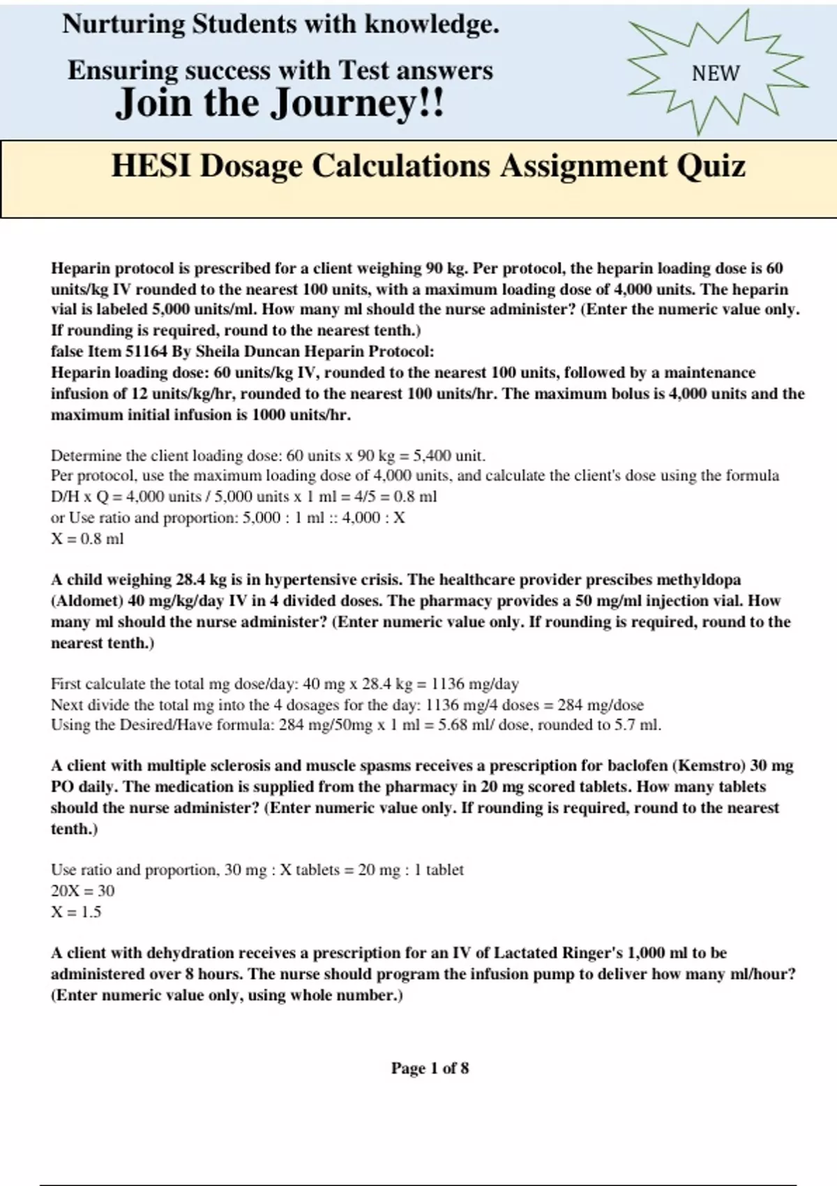 HESI Dosage Calculations Assignment Quiz Solved 100% Correct
