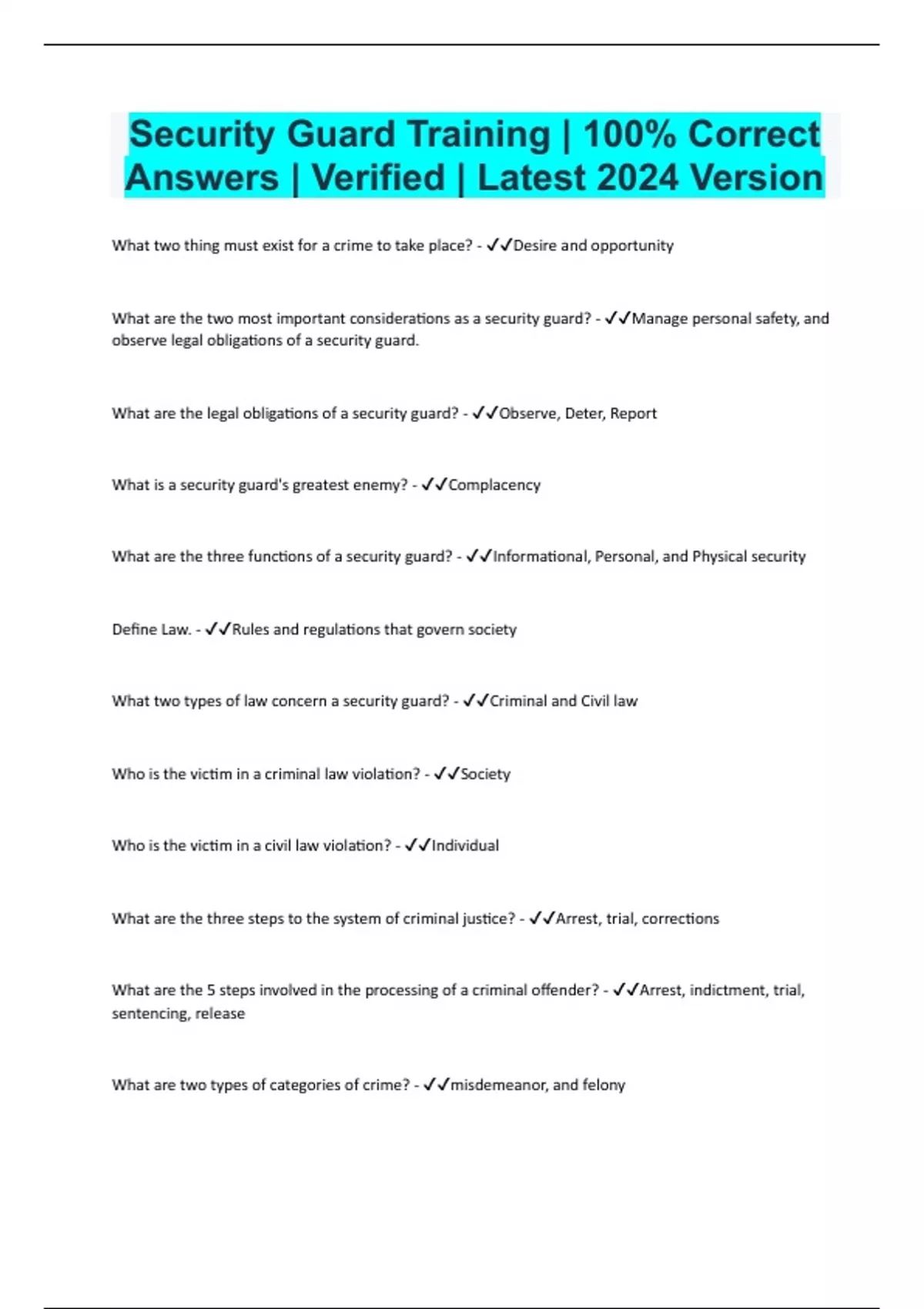 Security Guard Training | 100% Correct Answers | Verified | Latest 2024 Version
