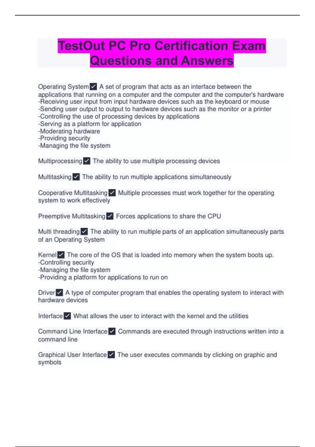 Operating System A set of program that acts as an interface between the applications that running on a computer and the computer and the computer's hardware -Receiving user input from input hardware devices such as the keyboard or mouse -Sending user output to output to hardware devices such as the monitor or a printer -Controlling the use of processing devices by applications -Serving as a platform for application -Moderating hardware -Providing security -Managing the file system Multiprocessing The ability to use multiple processing devices Multitasking The ability to run multiple applications simultaneously Cooperative Multitasking Multiple processes must work together for the operating system to work effectively Preemptive Multitasking Forces applications to share the CPU Multi threading The ability to run multiple parts of an application simultaneously parts of an Operating System Kernel The core of the OS that is loaded into memory when the system boots up. -Controlling security -Managing the file system -Providing a platform for applications to run on