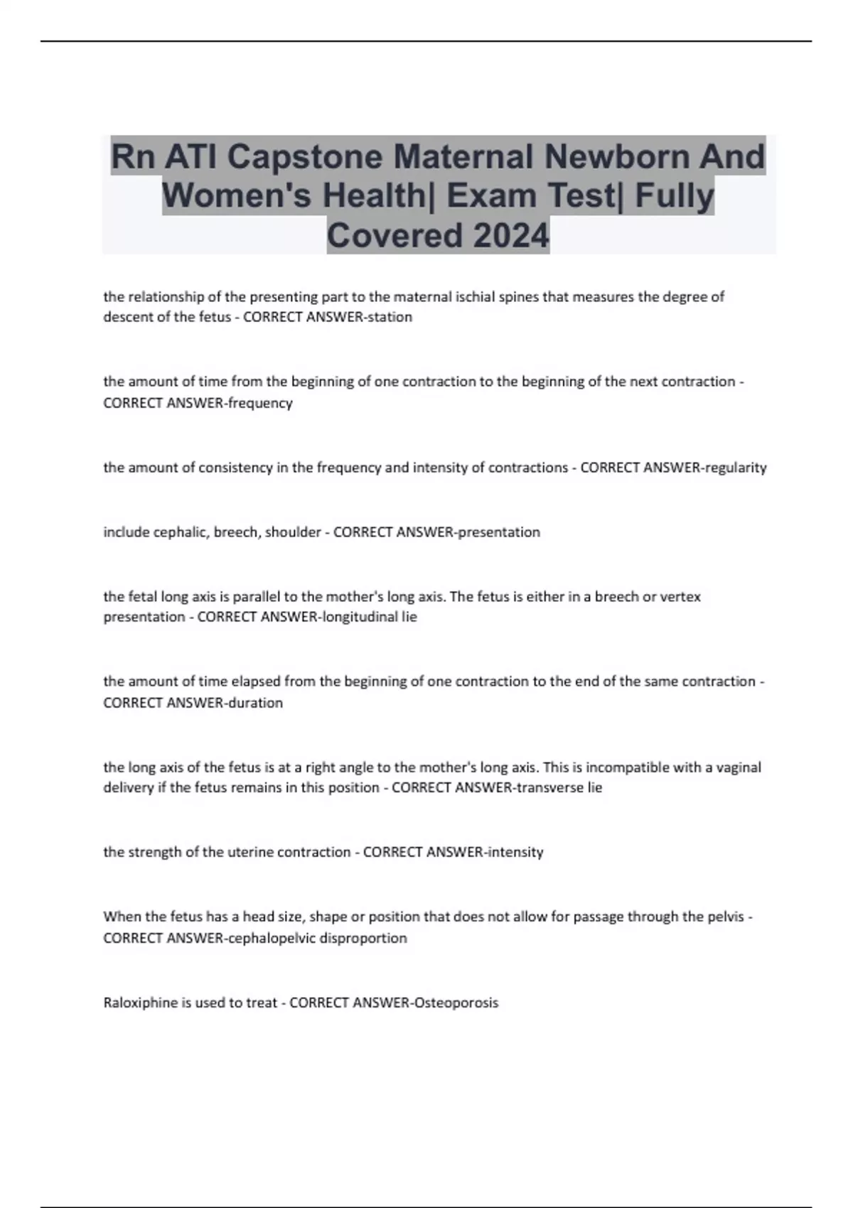 Rn ATI Capstone Maternal Newborn And Women's Health| Exam Test| Fully Covered 2024 the relationship of the presenting part to the maternal ischial spines that measures the degree of descent of the fetus - CORRECT ANSWER-station the amount of time from the beginning of one contraction to the beginning of the next contraction - CORRECT ANSWER-frequency the amount of consistency in the frequency and intensity of contractions - CORRECT ANSWER-regularit