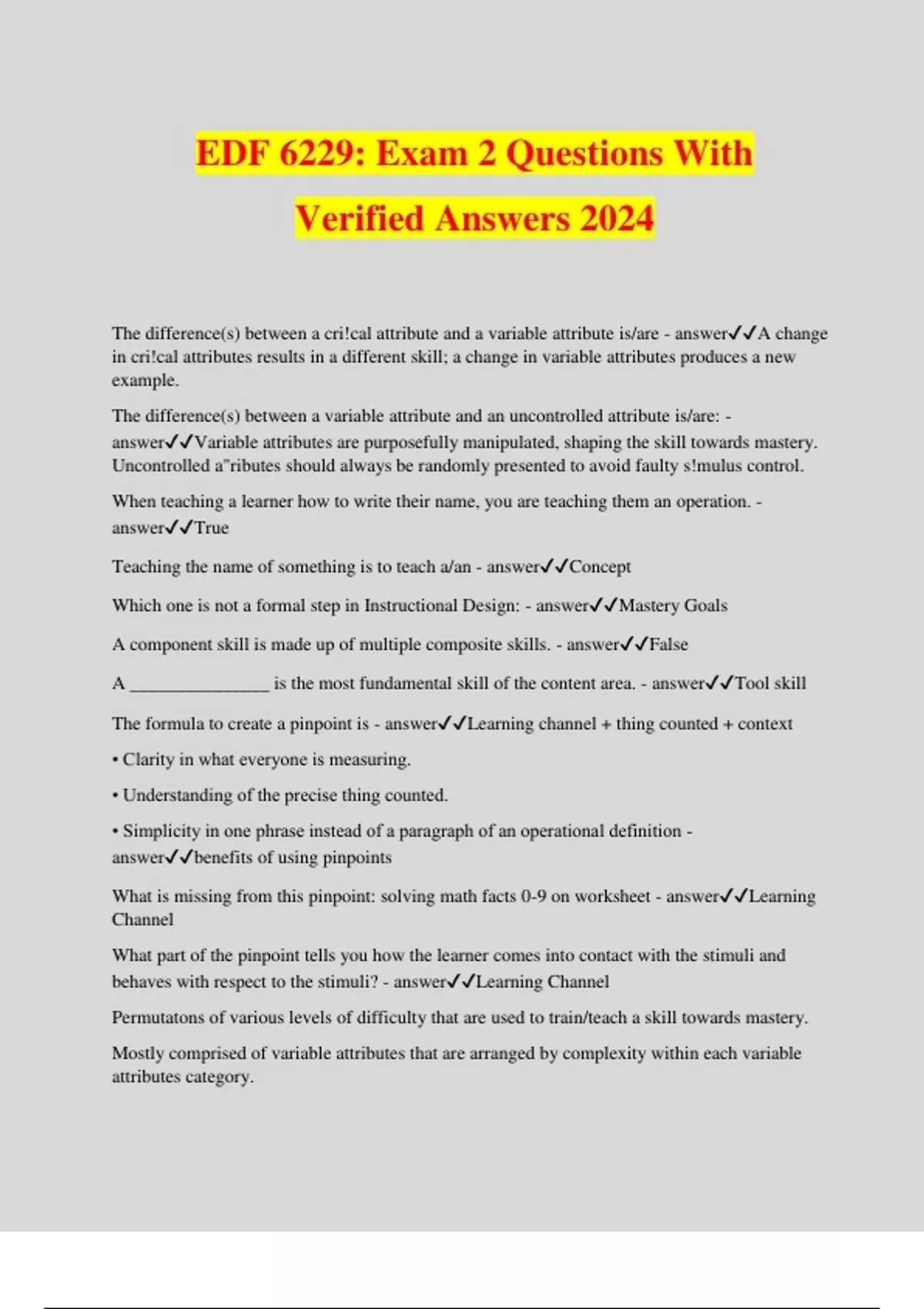 EDF 6229: Exam 2 Questions With Verified Answers 2024 The difference(s) between a cri!cal attribute and a variable attribute is/are - answerA change in cri!cal attributes results in a different skill; a change in variable attributes produces a new example. The difference(s) between a variable attribute and an uncontrolled attribute is/are: - answerVariable attributes are purposefully manipulated, shaping the skill towards mastery. Uncontrolled a"ributes should always be randomly presented to avoid faulty s!mulus control. When teaching a learner how to write their name, you are teaching them an operation. - answerTrue Teaching the name of something is to teach a/an - answerConcept Which one is not a formal step in Instructional Design: - answerMastery Goals A component skill is made up of multiple composite skills. - answerFalse A _______________ is the most fundamental skill of the content area. - answerTool skill The formula to create a pinpoint is - answerLearning channel + thing counted + context • Clarity in what everyone is measuring. • Understanding of the precise thing counted. • Simplicity in one phrase instead of a paragraph of an operational definition - answerbenefits of using pinpoints What is missing from this pinpoint: solving math facts 0-9 on worksheet - answerLearning Channel What part of the pinpoint tells you how the learner comes into contact with the stimuli and behaves with respect to the stimuli? - answerLearning Channel Permutatons of various levels of difficulty that are used to train/teach a skill towards mastery. Mostly comprised of variable attributes that are arrang