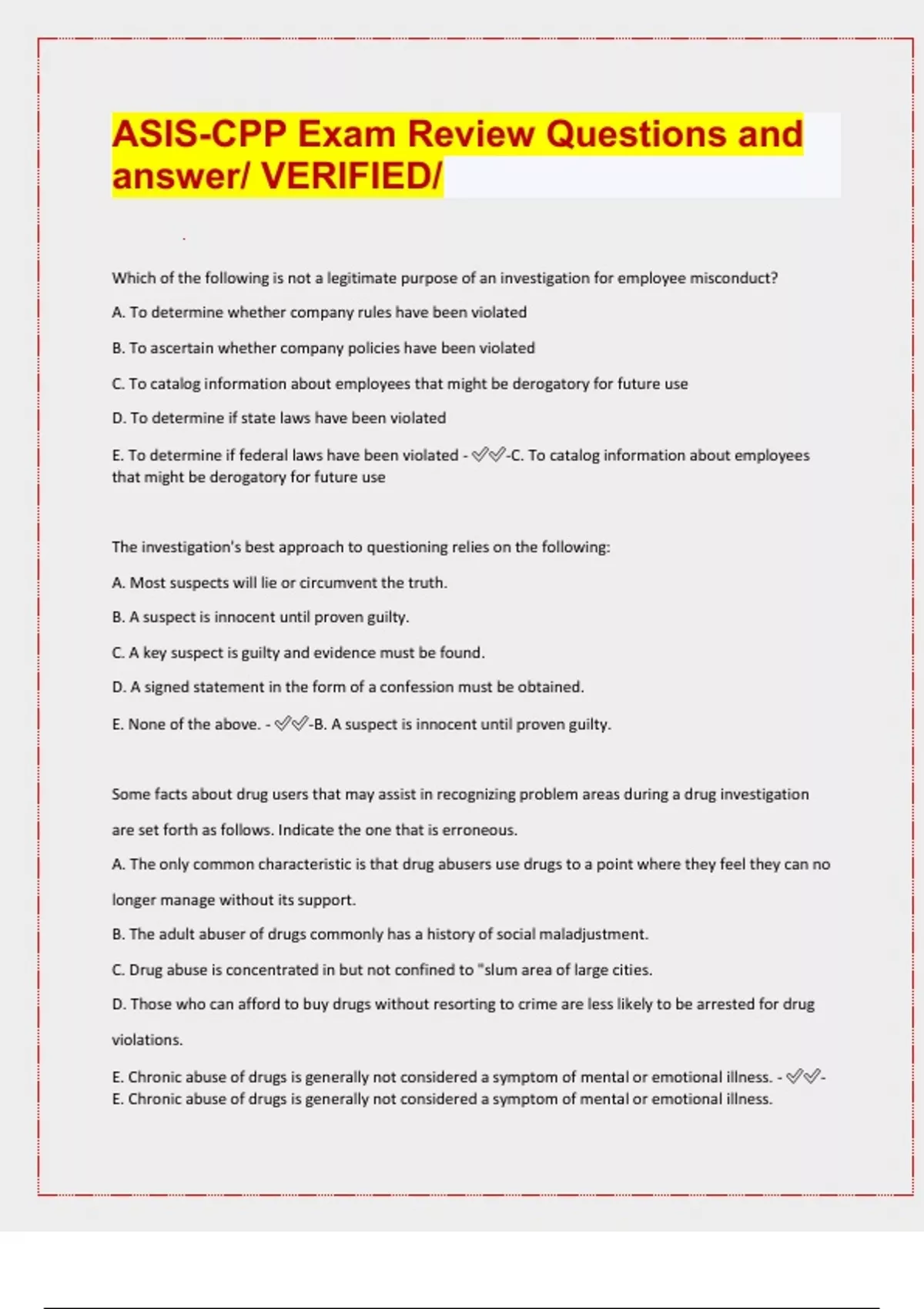 ASIS-CPP Exam Review Questions and answer/ VERIFIED/ Which of the following is not a legitimate purpose of an investigation for employee misconduct? A. To determine whether company rules have been violated B. To ascertain whether company policies have been violated C. To catalog information about employees that might be derogatory for future use D. To determine if state laws have been violated E. To determine if federal laws have been violated - -C. To catalog information about employees that might be derogatory for future use The investigation's best approach to questioning relies on the following: A. Most suspects will lie or circumvent the truth. B. A suspect is innocent until proven guilty. C. A key suspect is guilty and evidence must be found. D. A signed statement in the form of a confession must be obtained. E. None of the above. - -B. A suspect is innocent until proven guilty. Some facts about drug users that may assist in recognizing problem areas during a drug investigation are set forth as follows. Indicate the one that is erroneous. A. The only common characteristic is that drug abusers use drugs to a point where they feel they can no longer manage without its support. B. The adult abuser of drugs commonly has a history of social maladjustment. C. Drug abuse is concentrated in but not confined to "slum area of large cities. D. Those who can afford to buy drugs without resorting to crime are less likely to be arrested for drug violations. E. Chronic abuse of drugs is generally not considered a symptom of mental or emotional illness. - - E. Chronic abuse of drugs is generally not considered a s