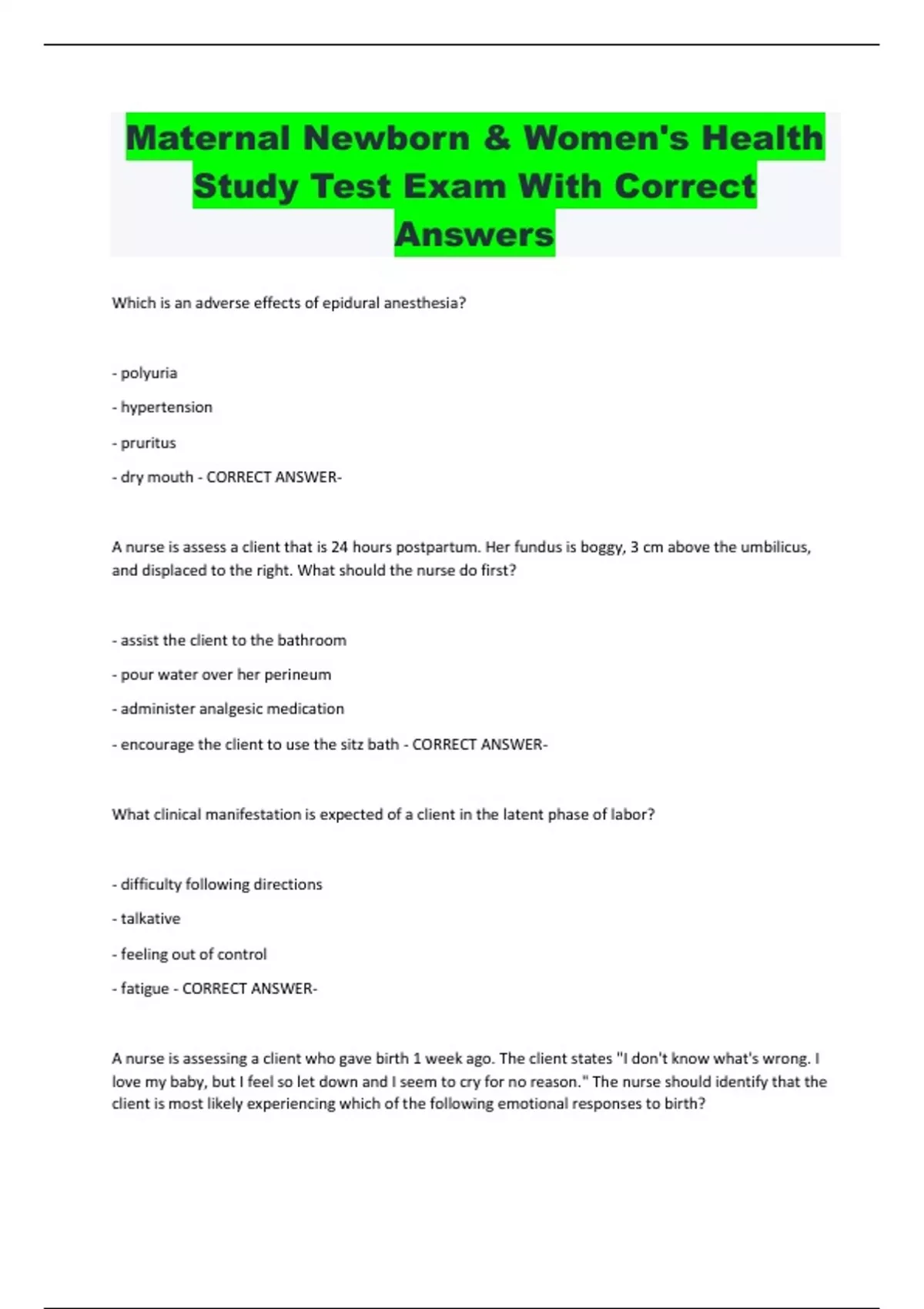 Maternal Newborn & Women's Health Study Test Exam With Correct Answers Which is an adverse effects of epidural anesthesia? - polyuria - hypertension - pruritus - dry mouth - CORRECT ANSWERA nurse is assess a client that is 24 hours postpartum. Her fundus is boggy, 3 cm above the umbilicus, and displaced to the right. What should the nurse do first? - assist the client to the bathroom - pour water over her perineum - administer analgesic medication - encourage the client to use the sitz bath - CORRECT ANSWER