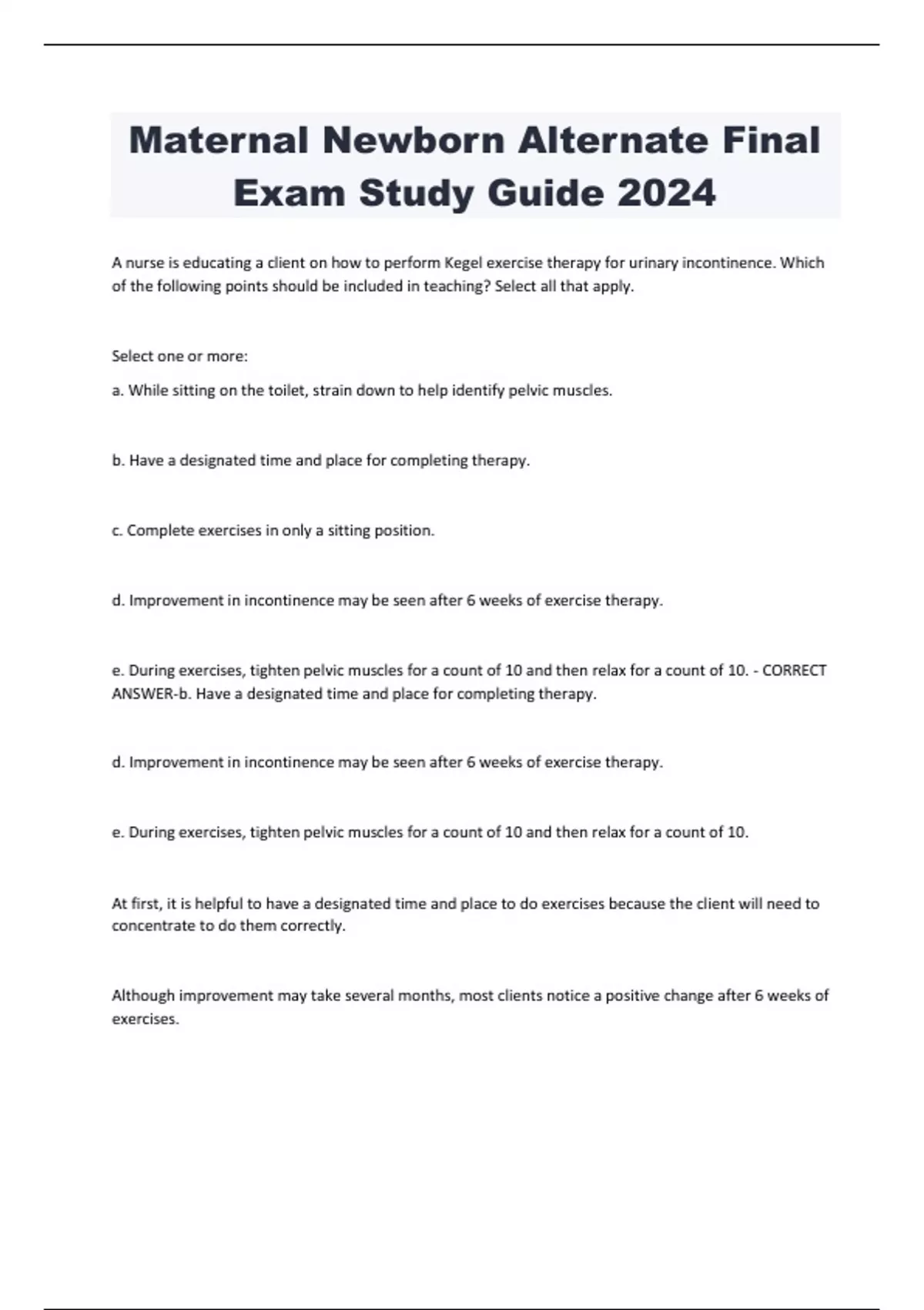 Maternal Newborn Alternate Final Exam Study Guide 2024 A nurse is educating a client on how to perform Kegel exercise therapy for urinary incontinence. Which of the following points should be included in teaching? Select all that apply. Select one or more: a. While sitting on the toilet, strain down to help identify pelvic muscles. b. Have a designated time and place for completing therapy. c. Complete exercises in only a sitting position. d. Improvement in incontinence may be seen after 6 weeks of exercise therapy. e. During exercises, tighten pelvic muscles for a count of 10 and then relax for a count of 10. - CORRECT ANSWER-b. Have a designated time and place for completing therapy. d. Improvement in incontinence may be seen after 6 weeks of exercise therapy. e. During exercises, tighten pelvic muscles for a count of 10 and then relax for a count of 10.
