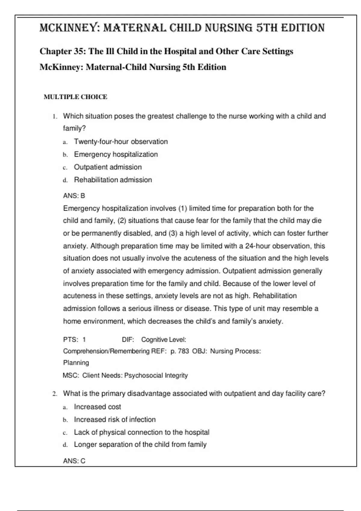 Maternal Child Nursing 5th Edition by McKinney- ISBN- 978-0323401708 TEST BANK Chapter 35: The Ill Child in the Hospital and Other Care Settings Verified 2024 Practice Questions and 100% Correct Answers with Explanations for Exam Preparation, Graded A+ Which situation poses the greatest challenge to the nurse working with a child and family? a. Twenty-four-hour observation b. Emergency hospitalization c. Outpatient admission d. Rehabilitation admission ANS: B Emergency hospitalization involves (1) limited time for preparation both for the child and family, (2) situations that cause fear for the family that the child may die or be permanently disabled, and (3) a high level of activity, which can foster further anxiety. Although preparation time may be limited with a 24-hour observation, this situation does not usually involve the acuteness of the situation and the high levels of anxiety associated with emergency admission. Outpatient admission generally involves preparation time for the family and child. Because of the lower level of acuteness in these settings, anxiety levels are not as high. Rehabilitation admission follows a serious illness or disease. This type of unit may resemble a home environment, which decreases the child’s and family’s anxiety. PTS: 1 DIF: Cognitive Level: Comprehension/Remembering REF: p. 783 OBJ: Nursing Process: Planning MSC: Client Needs: Psychosocial Integrity 2. What is the primary disadvantage associated with outpatient and day facility care? a. Increased cost b. Increased risk of infection c. Lack of physical connection to the hospital d. Longer separation of the child from family ANS: C Outpatient and day facility care do not provide extended care; therefore, a child requiring extended care should be transferred to the hospital, causing increased stress to the child and parents. This type of care decreases cost and infection and minimizes separation between the child and family. PTS: 1 DIF: Cognitive Level: Knowledge/Remembering REF: p. 783 OBJ: Nursing Process: Planning MSC: Client Needs: Safe and Effective Care Environment
