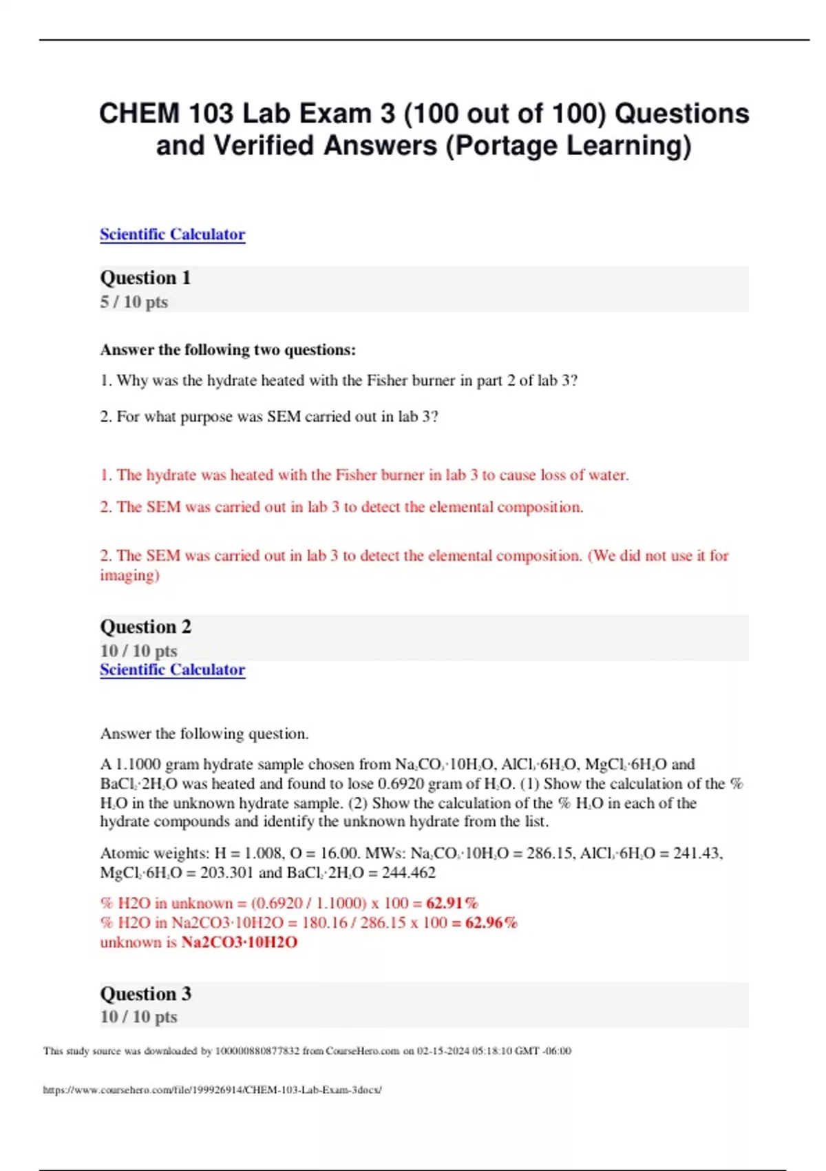 CHEM 103 Lab Exam 3 (LATEST UPDATE) Questions and Verified Answers (Portage Learning).