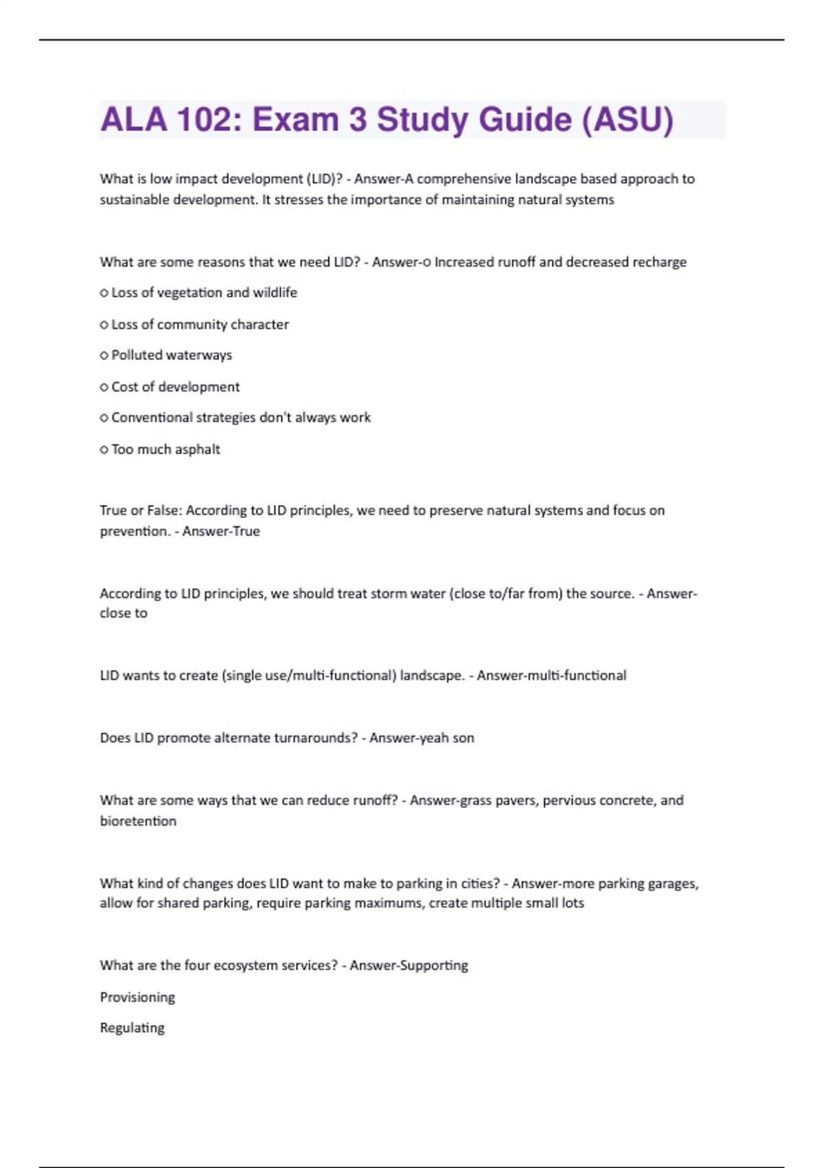 What is low impact development (LID)? - Answer-A comprehensive landscape based approach to sustainable development. It stresses the importance of maintaining natural systems What are some reasons that we need LID? - Answer-○ Increased runoff and decreased recharge ○ Loss of vegetation and wildlife ○ Loss of community character ○ Polluted waterways ○ Cost of development ○ Conventional strategies don't always work ○ Too much asphalt True or False: According to LID principles, we need to preserve natural systems and focus on prevention. - Answer-True According to LID principles, we should treat storm water (close to/far from) the source. - Answerclose to LID wants to create (single use/multi-functional) landscape. - Answer-multi-functional Does LID promote alternate turnarounds? - Answer-yeah son What are some ways that we can reduce runoff? - Answer-grass pavers, pervious concrete, and bioretention What kind of changes does LID want to make to parking in cities? - Answer-more parking garages, allow for shared parking, require parking maximums, create multiple small lots What are the four ecosystem services? - Answer-Supporting Provisioning RegulatingCultural What are a few guiding principles for design? - Answer-Do not harm Use the precautionary principle Design with nature and culture Use a decision making process What is a natural landscape? - Answer-A landscape untouched by humanss How about a managed landscape? - Answer-Has some human impact Is there a strong effort to preserve open desert spaces in Arizona? - Answer-Indeed!