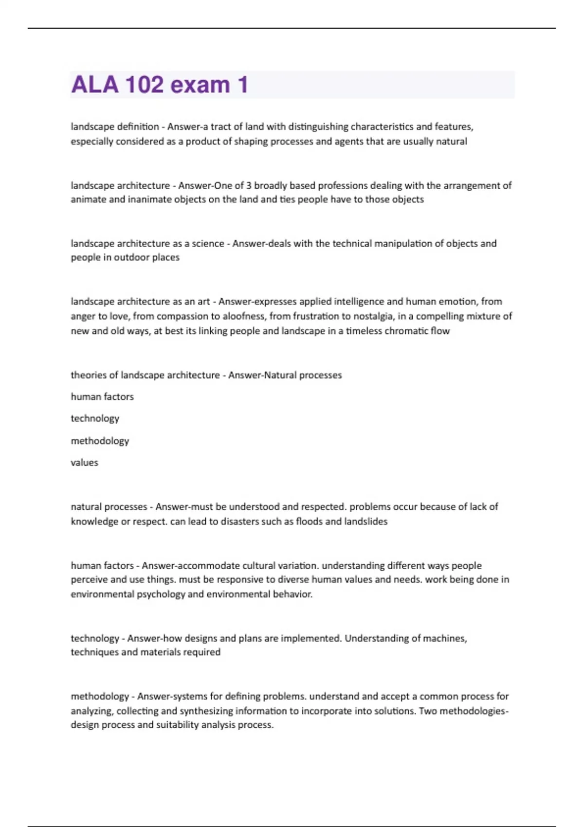 landscape definition - Answer-a tract of land with distinguishing characteristics and features, especially considered as a product of shaping processes and agents that are usually natural landscape architecture - Answer-One of 3 broadly based professions dealing with the arrangement of animate and inanimate objects on the land and ties people have to those objects landscape architecture as a science - Answer-deals with the technical manipulation of objects and people in outdoor places landscape architecture as an art - Answer-expresses applied intelligence and human emotion, from anger to love, from compassion to aloofness, from frustration to nostalgia, in a compelling mixture of new and old ways, at best its linking people and landscape in a timeless chromatic flow theories of landscape architecture - Answer-Natural processes human factors technology methodology values natural processes - Answer-must be understood and respected. problems occur because of lack of knowledge or respect. can lead to disasters such as floods and landslides human factors - Answer-accommodate cultural variation. understanding different ways people perceive and use things. must be responsive to diverse human values and needs. work being done in environmental psychology and environmental behavior. technology - Answer-how designs and plans are implemented. Understanding of machines, techniques and materials required methodology - Answer-systems for defining problems. understand and accept a common process for analyzing, collecting and synthesizing information to incorporate into solutions. Two methodologiesdesign process and suitability analysis s - Answer-the profession is based on a set of values. these are generally acquired through life and then careers are often chosen to align with values. in landscape architecture an environmental ethic is at the root of the profession. in the ASLA code of ethics one of the first statements is about the profession as stewards of the land types of practice - Answer-landscape evaluation and planning site planning landscape design urban design landscape restoration professional options - Answer-private practice government non-profits and volunteer academic professional organizations - Answer-ASLA- American society of landscape architecture IFLA- international federation of landscape architects CELA- council of educators in landscape architecture education - Answer-accreditation bachelors masters phd changing attitudes towards nature: from I/Thou to I/ It - Answer--Fear and longing for security, personal relationships with nature, dependent for daily existence -Growing self confidence, increased intelligence, working with natural rhythms of nature -Aggressiveness and conquest -Responsibility and awareness, unification with nature first civilizations and the requirements of a city - Answer-1. production of a surplus of food2. some form of written communication 3. social organization to ensure continuity of supplies and control of labor force 4. technological expertise demonstrated through the development of higher quality tools Early cities of Jericho & Catal Huyuk - Answer--Homes entry through a hole in the roof -defensive character