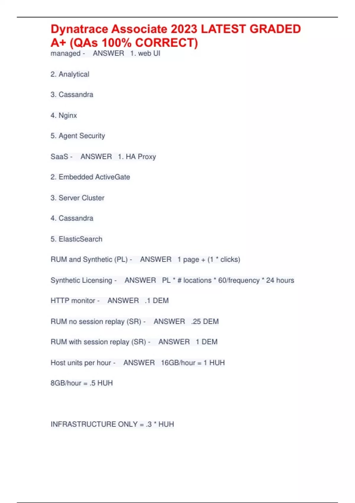 managed - ANSWER 1. web UI 2. Analytical 3. Cassandra 4. Nginx 5. Agent Security SaaS - ANSWER 1. HA Proxy 2. Embedded ActiveGate 3. Server Cluster 4. Cassandra 5. ElasticSearch RUM and Synthetic (PL) - ANSWER 1 page + (1 * clicks) Synthetic Licensing - ANSWER PL * # locations * 60/frequency * 24 hours HTTP monitor - ANSWER .1 DEM RUM no session replay (SR) - ANSWER .25 DEM RUM with session replay (SR) - ANSWER 1 DEM Host units per hour - ANSWER 16GB/hour = 1 HUH 8GB/hour = .5 HUH INFRASTRUCTURE ONLY = .3 * HUH