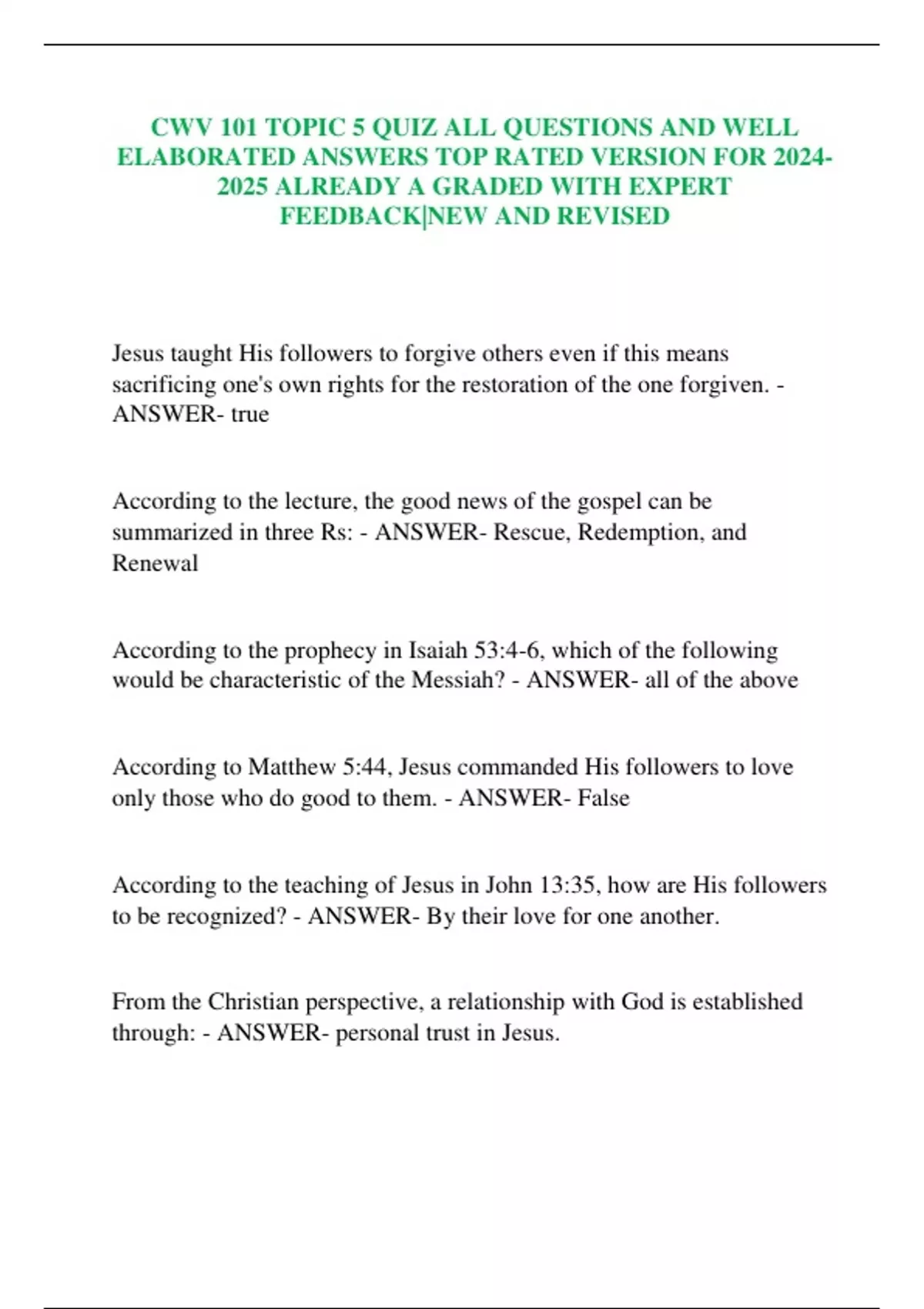 CWV 101 TOPIC 5 QUIZ ALL QUESTIONS AND WELL ELABORATED ANSWERS TOP RATED VERSION FOR 2024- 2025 ALREADY A GRADED WITH EXPERT FEEDBACK|NEW AND REVISED