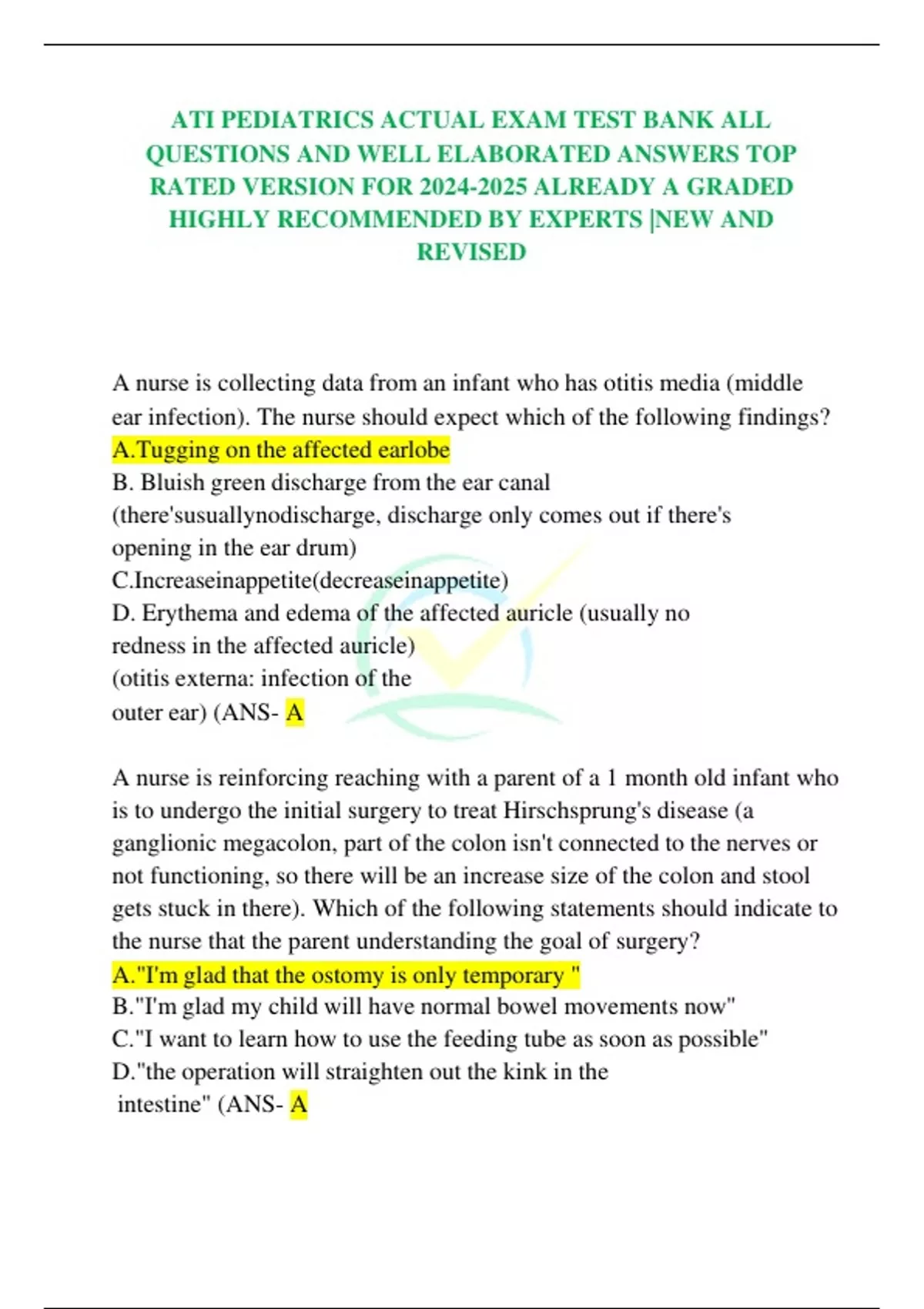 ATI PEDIATRICS ACTUAL EXAM TEST BANK ALL QUESTIONS AND WELL ELABORATED ANSWERS TOP RATED VERSION FOR ALREADY A GRADED HIGHLY RECOMMENDED BY EXPERTS |NEW AND REVISED