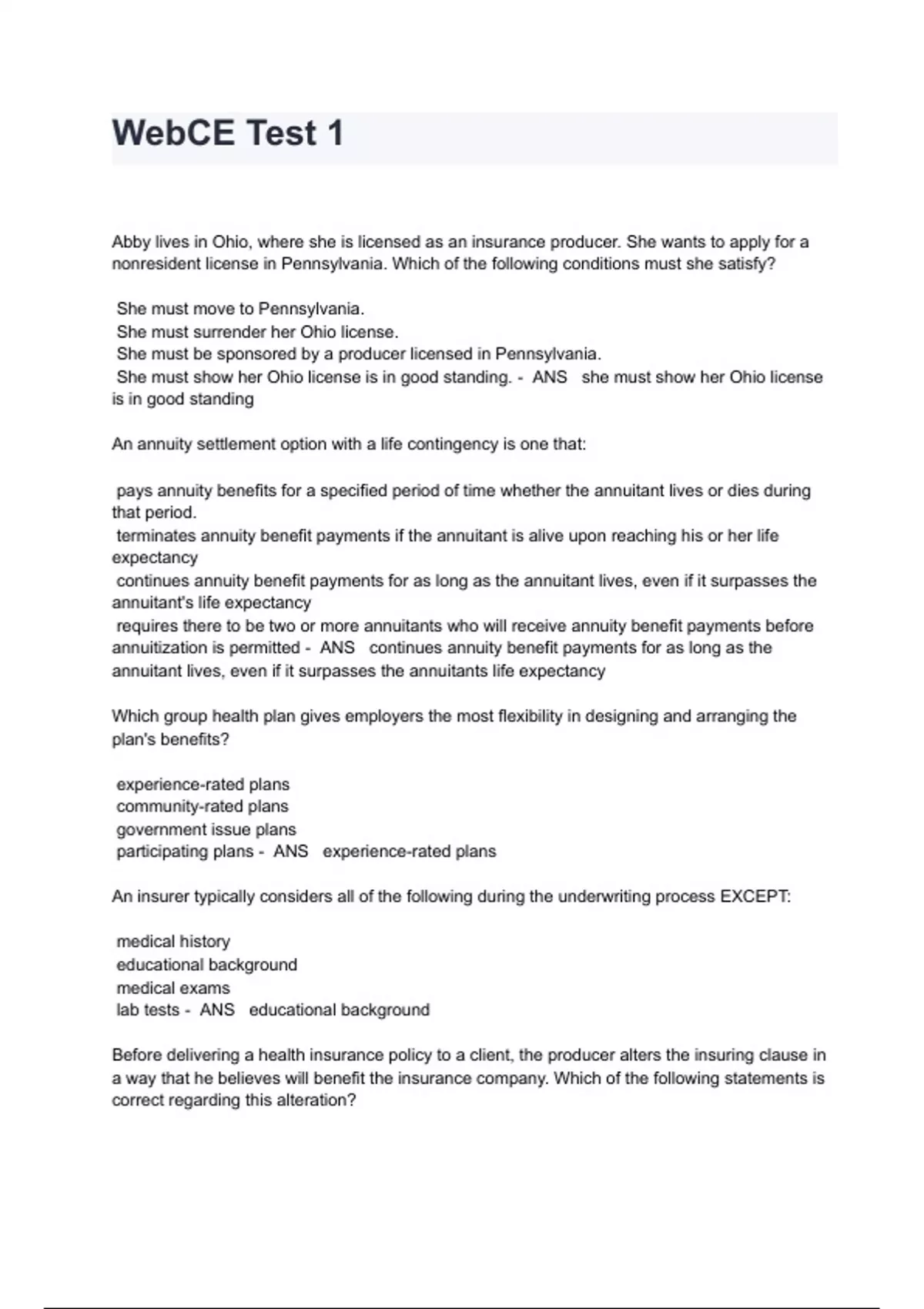 WebCE Test 1 Questions With Verified Solutions Abby lives in Ohio, where she is licensed as an insurance producer. She wants to apply for a nonresident license in Pennsylvania. Which of the following conditions must she satisfy? She must move to Pennsylvania. She must surrender her Ohio license. She must be sponsored by a producer licensed in Pennsylvania. She must show her Ohio license is in good standing. - ANS she must show her Ohio license is in good standing An annuity settlement option with a life contingency is one that: pays annuity benefits for a specified period of time whether the annuitant lives or dies during that period. terminates annuity benefit payments if the annuitant is alive upon reaching his or her life expectancy continues annuity benefit payments for as long as the annuitant lives, even if it surpasses the annuitant's life expectancy requires there to be two or more annuitants who will receive annuity benefit payments before annuitization is permitted - ANS continues annuity benefit payments for as long as the annuitant lives, even if it surpasses the annuitants life expectancy Which group health plan gives employers the most flexibility in designing and arranging the plan's benefits? experience-rated plans community-rated plans government issue plans participating plans - ANS experience-rated plans An insurer typically considers all of the following during the underwriting process EXCEPT: medical history educational background medical exams lab tests - ANS educational background Before delivering a health insurance policy to a client, the producer alters the insuring clause in a way that he believes will benefit the insurance company. Which of the following statements is correct regarding this alteration?