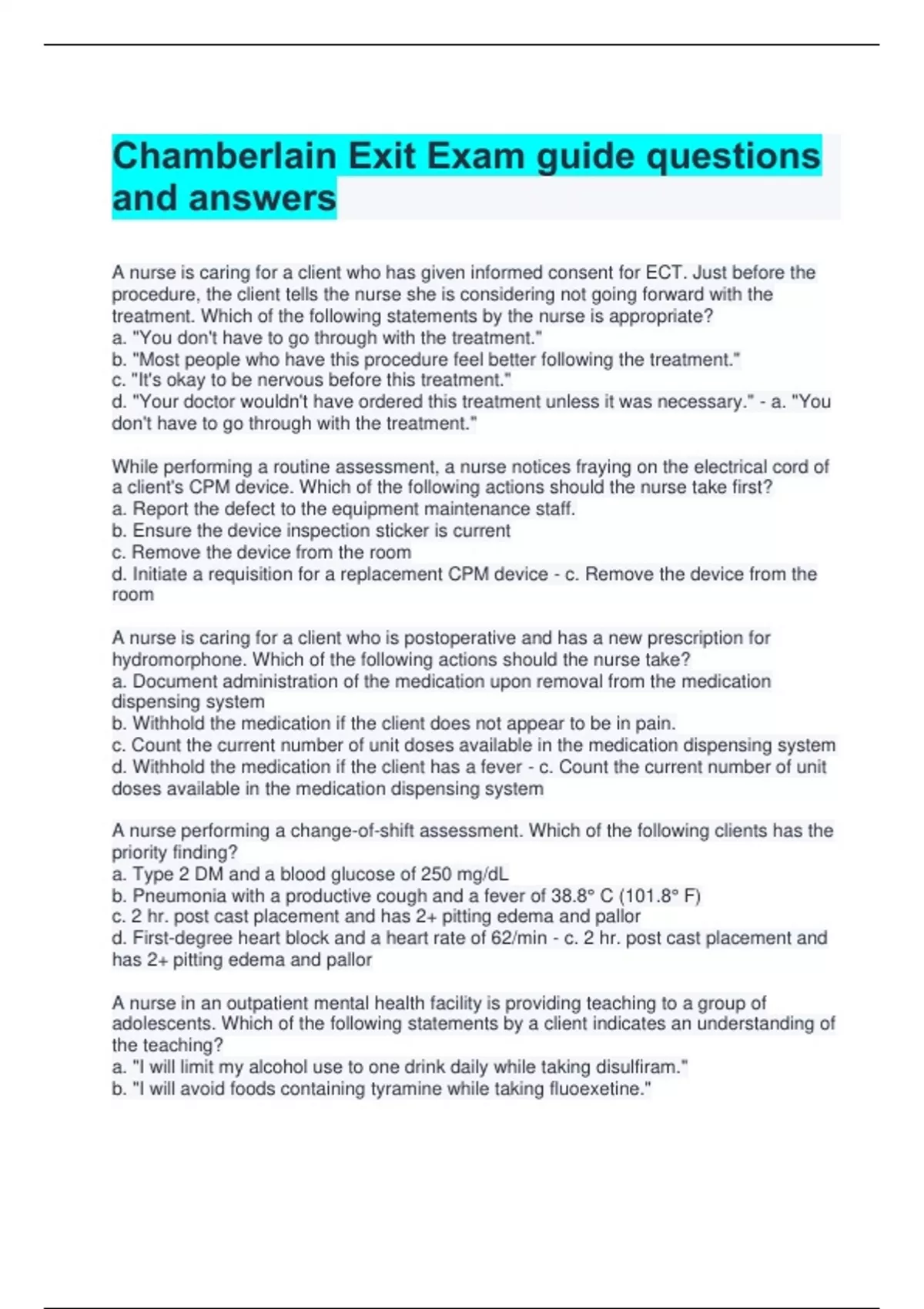 A nurse is caring for a client who has given informed consent for ECT. Just before the procedure, the client tells the nurse she is considering not going forward with the treatment. Which of the following statements by the nurse is appropriate? a. "You don't have to go through with the treatment." b. "Most people who have this procedure feel better following the treatment." c. "It's okay to be nervous before this treatment." d. "Your doctor wouldn't have ordered this treatment unless it was necessary." - a. "You don't have to go through with the treatment." While performing a routine assessment, a nurse notices fraying on the electrical cord of a client's CPM device. Which of the following actions should the nurse take first? a. Report the defect to the equipment maintenance staff. b. Ensure the device inspection sticker is current c. Remove the device from the room d. Initiate a requisition for a replacement CPM device - c. Remove the device from the room A nurse is caring for a client who is postoperative and has a new prescription for hydromorphone. Which of the following actions should the nurse take? a. Document administration of the medication upon removal from the medication dispensing system b. Withhold the medication if the client does not appear to be in pain. c. Count the current number of unit doses available in the medication dispensing system d. Withhold the medication if the client has a fever - c. Count the current number of unit doses available in the medication dispensing system A nurse performing a change-of-shift assessment. Which of the following clients has the priority finding? a. Type 2 DM and a blood glucose of 250 mg/dL b. Pneumonia with a productive cough and a fever of 38.8° C (101.8° F) c. 2 hr. post cast placement and has 2+ pitting edema and pallor d. First-degree heart block and a heart rate of 62/min - c. 2 hr. post cast placement and has 2+ pitting edema and pallor A nurse in an outpatient mental health facility is providing teaching to a group of adolescents. Which of the following statements by a client indicates an understanding of the teaching? a. "I will limit my alcohol use to one drink daily while taking disulfiram." b. "I will avoid foods containing tyramine while taking fluoexetine." c. "I will take the sustained-release methylphenidate every morning." d. "I will take my lithium on an empty stomach." - c. "I will take the sustained-release methylphenidate every morning." A nurse in the emergency department is assessing client who has major depressive disorder. Which of the following actions should the nurse take first? a. Administer Zofran to the client for nausea b. Implement seizure precautions for the client c. Encourage the client to verbalize feelings d. Obtain the client's weight - b. Implement seizure precautions for the client A nurse is completing an admission assessment for a client who has narcissistic personality disorder. Which of the following should the nurse expect? a. Suspicious of others b. Exhibits separation anxiety c. Ritualistic behavior d. Preoccupied with aging - d. Preoccupied with aging A nurse is planning care for a group of clients and is working with one LPN and one AP. Which of the following actions should the nurse take first to manage her time effectively? a. Develop an hourly time frame for tasks b. Schedule daily activities c. Determine goals of the day d. Delegate tasks to the AP - c. Determine goals of the day A nurse is developing a plan of care for a client who has preeclampsia and is to receive magnesium sulfate via continuous IV infusion. Which of the following actions should the nurse include in the plan? a. Restrict the client's total fluid intake to 250 mL/hr. b. Measure the client's urine output every hour c. Give the client protamine if signs of magnesium sulfate toxicity occur d. Monitor the FHR via Doppler every 30 min - b. Measure the client's urine output every hour A nurse is caring for a group of clients. Which of the following wounds should the nurse expect to heal by primary intention? a. Infected laceration b. Stage II pressure ulcer c. Approximated surgical incision d. Partial-thickness burn - c. Approximated surgical incision A nurse in an acute mental health care facility is prioritizing care for multiple clients. Which of the following clients should the nurse see first? a. Client taking clozapine to treat schizophrenia and reports sore throat b. Client has OCD and is upset about a change in daily routine c. Client has narcissistic personality disorder and is mocking others during group therapy d. Client who has depressive disorder and requires assistance with ADLs - a. Client taking clozapine to treat schizophrenia and reports sore throat A nurse is caring for a client who has an implanted venous access port. Which of the following should the nurse use to assess the port? a. An angiocatheter b. A butterfly needle c. A non-coring needle d. A 25 gauge needle - c. A non-coring needle