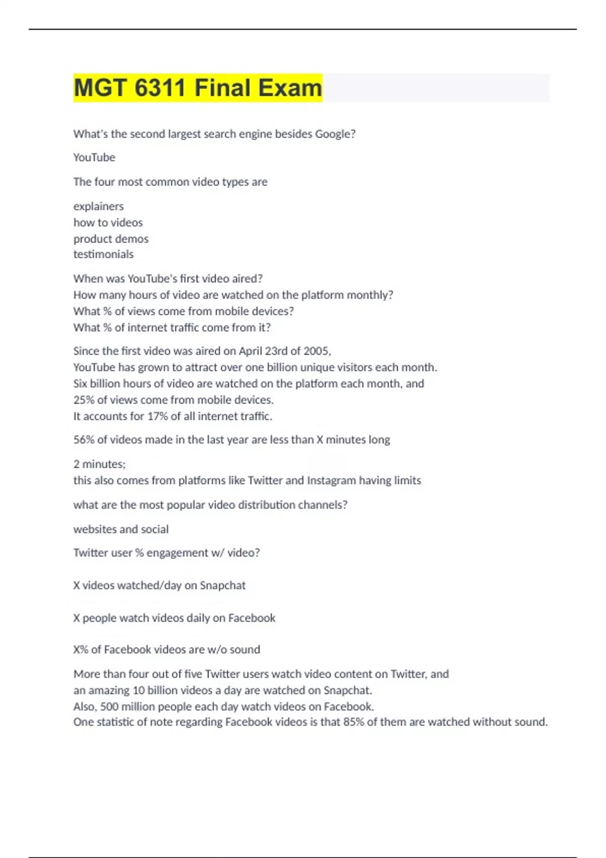 MGT 6311 Final Exam What's the second largest search engine besides Google? YouTube The four most common video types are explainers how to videos product demos testimonials When was YouTube's first video aired? How many hours of video are watched on the platform monthly? What % of views come from mobile devices? What % of internet traffic come from it? Since the first video was aired on April 23rd of 2005, YouTube has grown to attract over one billion unique visitors each month. Six billion hours of video are watched on the platform each month, and 25% of views come from mobile devices.