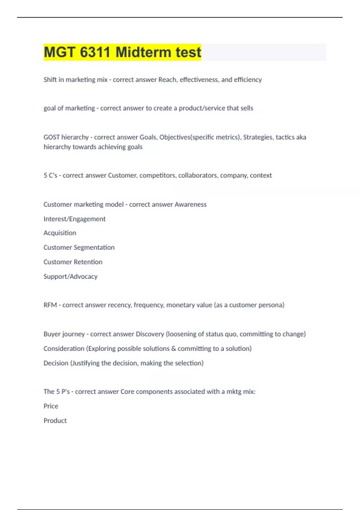 MGT 6311 Midterm test Shift in marketing mix - correct answer Reach, effectiveness, and efficiency goal of marketing - correct answer to create a product/service that sells GOST hierarchy - correct answer Goals, Objectives(specific metrics), Strategies, tactics aka hierarchy towards achieving goals 5 C's - correct answer Customer, competitors, collaborators, company, context Customer marketing model - correct answer Awareness