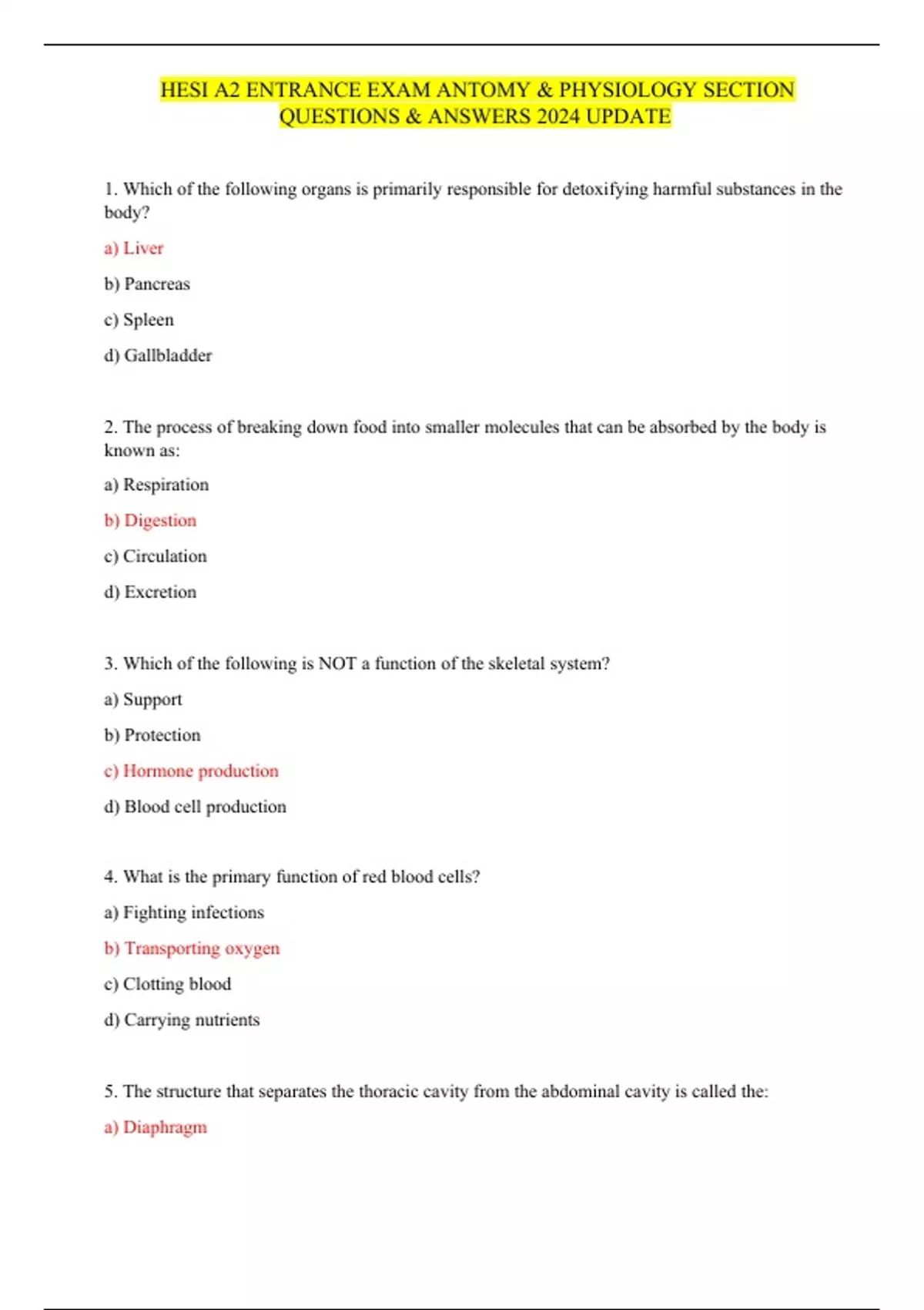 HESI A2 ENTRANCE EXAM ANTOMY & PHYSIOLOGY SECTION QUESTIONS & ANSWERS 2024 UPDATE 1. Which of the following organs is primarily responsible for detoxifying harmful substances in the body? a) Liver b) Pancreas c) Spleen d) Gallbladder 2. The process of breaking down food into smaller molecules that can be absorbed by the body is known as: a) Respiration b) Digestion c) Circulation d) Excretion 3. Which of the following is NOT a function of the skeletal system? a) Support b) Protection c) Hormone production d) Blood cell production 4. What is the primary function of red blood cells? a) Fighting infections b) Transporting oxygen c) Clotting blood d) Carrying nutrients 5. The structure that separates the thoracic cavity from the abdominal cavity is called the: a) Diaphragm b) Pericardium c) Pleura d) Mesentery 6. Which of the following is NOT a function of the respiratory system? a) Gas exchange b) Regulation of blood pH c) Production of hormones d) Vocalization 7. Which of the following is NOT a component of the central nervous system? a) Brain b) Spinal cord c) Peripheral nerves d) Cranial nerves 8. Which of the following hormones is responsible for regulating blood sugar levels? a) Insulin b) Glucagon c) Estrogen d) Testosterone 9. The layer of skin that contains blood vessels, nerve endings, and sweat glands is the: a) Epidermis b) Dermis c) Hypodermis d) Subcutis 10. Which of the following is NOT a function of the urinary system? a) Regulation of blood pressure b) Removal of waste products c) Production of hormones d) Regulation of electrolyte balance 11. Which of the following is NOT a type of muscle tissue? a) Skeletal b) Cardiac c) Smooth d) Dense 12. What is the function of the lymphatic system? a) Transportation of oxygen b) Filtration of blood c) Regulation of body temperature d) Defense against pathogens 13. Which of the following is the primary function of the small intestine? a) Absorption of nutrients b) Mechanical digestion c) Storage of bile d) Production of enzymes 14. Which of the following structures is NOT part of the female reproductive system? a) Uterus b) Ovary c) Prostate gland d) Vagina 15. What is the function of the adrenal glands? a) Regulation of blood sugar levels b) Production of insulin c) Production of stress hormones d) Regulation of body temperature 16. The movement of molecules from an area of higher concentration to an area of lower concentration is called: a) Active transport b) Osmosis c) Diffusion d) Filtration 17. What is the function of the cerebellum? a) Regulation of body temperature b) Coordination of movement c) Regulation of hunger d) Production of hormones 18. Which of the following is NOT a component of blood? a) Red blood cells b) White blood cells c) Platelets d) Plasma e) Hemoglobin 19. The hormone responsible for regulating calcium levels in the blood is: a) Estrogen b) Insulin c) Parathyroid hormone d) Thyroxine 20. Which of the following is NOT a function of the integumentary system? a) Protection against pathogens b) Regulation of body temperature c) Production of hormones d) Sensation 21. What is the function of the pancreas in the digestive system? a) Production of bile b) Absorption of nutrients c) Regulation of blood sugar levels d) Storage of nutrients 22. Which of the following is NOT a function of the cardiovascular system? a) Transporting nutrients b) Removing waste products c) Regulation of blood pressure d) Production of bile 23. What is the purpose of the myelin sheath? a) To provide insulation for nerve fibers b) To produce hormones c) To store neurotransmitters d) To regulate body temperature 24. Which of the following bones is NOT part of the axial skeleton? a) Skull b) Ribs c) Scapula d) Vertebrae 25. The structure that connects muscle to bone is called a: a) Ligament b) Tendon c) Cartilage d) Synapse 26. Which of the following is NOT a function of the hypothalamus? a) Regulation of body temperature b) Production of hormones c) Regulation of hunger and thirst d) Control of the pituitary gland 27. What is the function of the Eustachian tube? a) Regulation of blood pressure b) Regulation of body temperature c) Equalization of pressure in the middle ear d) Production of hormones 28. Question: What is the primary function of the respiratory system? • Answer: The primary function of the respiratory system is to facilitate gas exchange, specifically oxygen and carbon dioxide, between the body and the environment. 29. Question: Which organ is responsible for filtering blood, removing toxins, and producing bile? a. Answer: The liver is responsible for filtering blood, removing toxins, and producing bile. 30. Question: Which part of the brain is responsible for coordinating voluntary muscle movements and maintaining balance and posture? a. Answer: The cerebellum is responsible for coordinating voluntary muscle movements and maintaining balance and posture. 31. Question: What type of joint is the elbow joint? a. Answer: The elbow joint is a hinge joint, allowing movement primarily in one plane, like a door hinge. 32. Question: What is the function of red blood cells? a. Answer: Red blood cells, or erythrocytes, are responsible for transporting oxygen from the lungs to the body's tissues and removing carbon dioxide from the tissues to the lungs. 33. Question: Which hormone is responsible for regulating blood sugar levels? a. Answer: Insulin, produced by the pancreas, is responsible for regulating blood sugar levels by facilitating the uptake of glucose into cells. 34. Question: What is the role of the kidneys in the urinary system? a. Answer: The kidneys filter blood to remove waste products and excess substances, regulate electrolyte balance, and maintain fluid balance by producing urine. 35. Question: Which structure connects the muscles to bones? a. Answer: Tendons connect muscles to bones, transmitting the force generated by muscle contraction to produce movement at the joints. 36. Question: What is the purpose of the lymphat