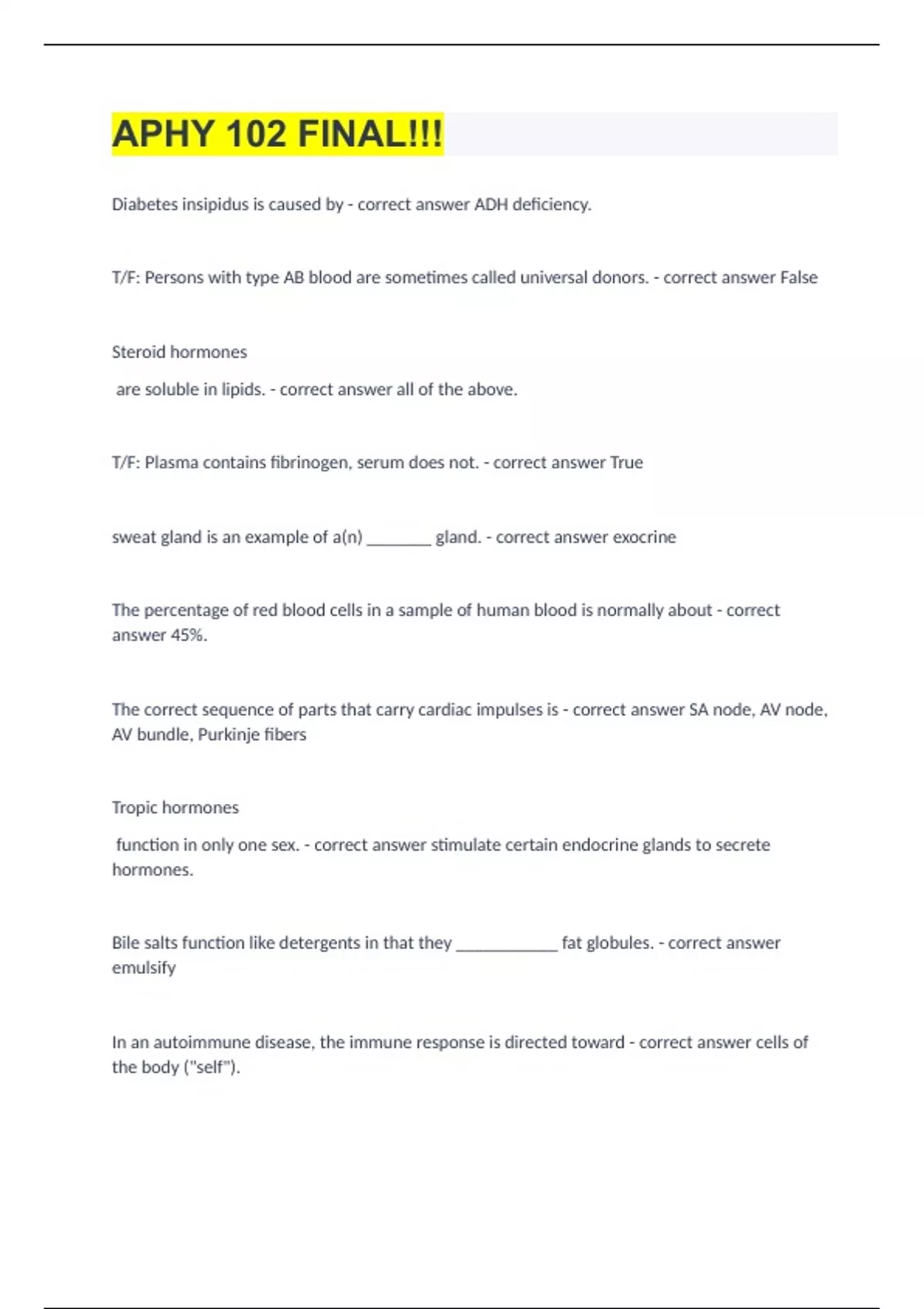 APHY 102 FINAL!!! Diabetes insipidus is caused by - correct answer ADH deficiency. T/F: Persons with type AB blood are sometimes called universal donors. - correct answer False Steroid hormones are soluble in lipids. - correct answer all of the above. T/F: Plasma contains fibrinogen, serum does not. - correct answer True sweat gland is an example of a(n) _______ gland. - correct answer exocrine The percentage of red blood cells in a sample of human blood is normally about - correct answer 45%. The correct sequence of parts that carry cardiac impulses is - correct answer SA node, AV node, AV bundle, Purkinje fibers