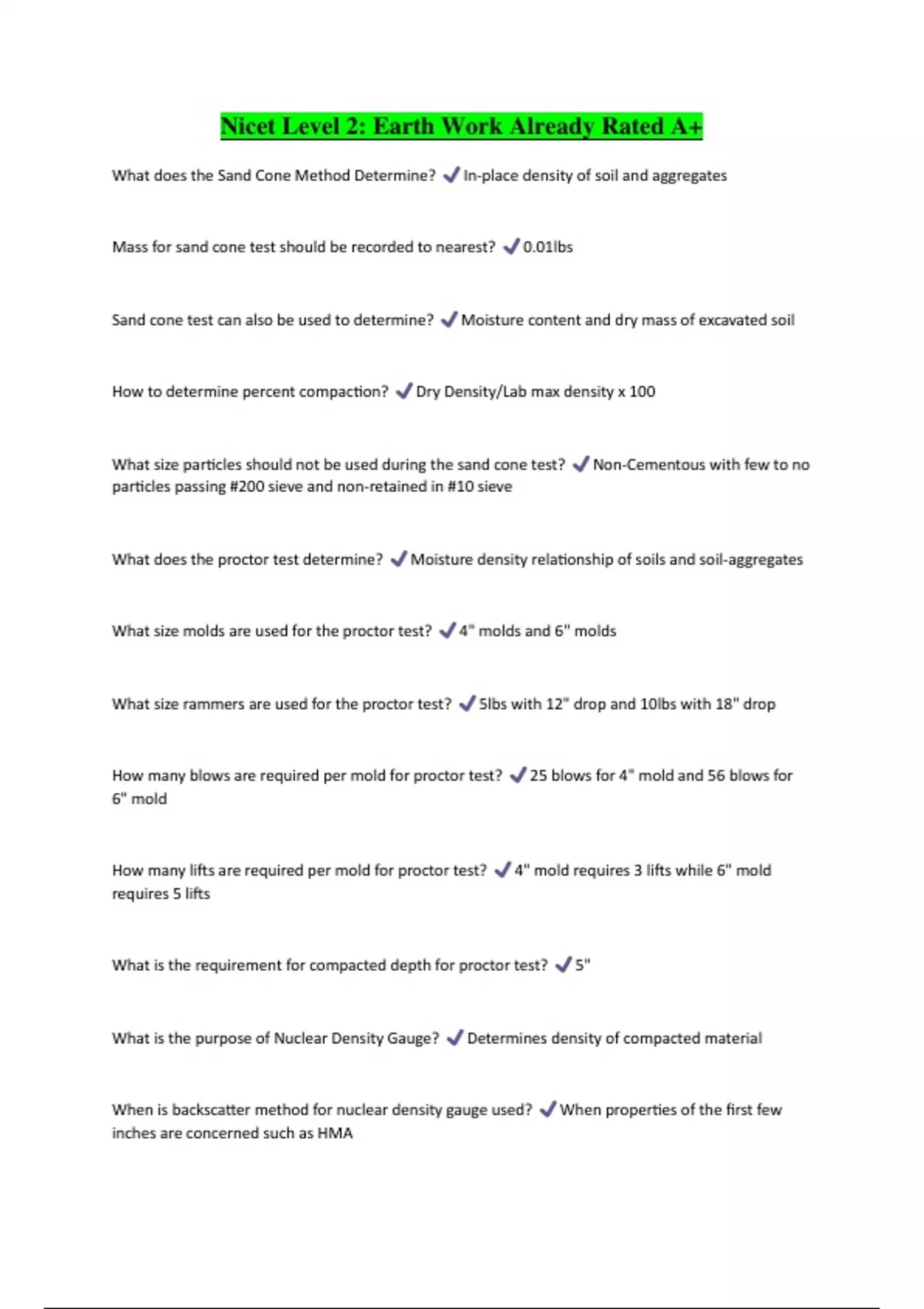 Nicet Level 2: Earth Work Already Rated A+ What does the Sand Cone Method Determine? In-place density of soil and aggregates Mass for sand cone test should be recorded to nearest? Sand cone test can also be used to determine? 0.01lbs Moisture content and dry mass of excavated soil How to determine percent compaction? Dry Density/Lab max density x 100 What size particles should not be used during the sand cone test? particles passing #200 sieve and non-retained in #10 sieve What does the proctor test determine? Non-Cementous with few to no Moisture density relationship of soils and soil-aggregates What size molds are used for the proctor test? What size rammers are used for the proctor test? 4" molds and 6" molds 5lbs with 12" drop and 10lbs with 18" drop How many blows are required per mold for proctor test? 6" mold How many lifts are required per mold for proctor test? requires 5 lifts 25 blows for 4" mold and 56 blows for 4" mold requires 3 lifts while 6" mold What is the requirement for compacted depth for proctor test? What is the purpose of Nuclear Density Gauge? 5" Determines density of compacted material When is backscatter method for nuclear density gauge used? inches are concerned such as HMA When properties of the first few When properties are within 2"-12" When is Direct Transmission for nuclear density gauge used? are concerned such as compacted backfill What is the spacing for multiple nuclear density gauge that are being conducted? be spaced 30' from each other What are the requirements when preparing to do the nuclear density test? Each test has to 6" away from verticle projections and 24" away from a wall What is the void space underneath the nuclear density gauge? 1/8" What is the Wet Density test requirements for single direct transmission in soil conditions? .94lb/ft^3, SP: .74lb/ft^3 ML: 1.28lb/ft^3 What is the wet density test requirement for backscatter in soil conditions? ML: 3.39lb/ft^3 What is the wet density test requirements for single operator in soil conditions? SP: 1.29% ML: .99% What is the visual identification for Coarse Gravel? CL: .97% Particle of rock that will pass 3" but be retained in 3/4" sieve What is the visual identification for fine gravel? CL: Particle of rock that will pass 3/4" and be retained on a #4 Sieve What is the visual identification of Coarse Sand? retained in #10 sieve What is the visual identification of medium sand? Particle of rock that will pass #4 sieve and be Particles of rock that will pass #10 sieve and be retained on a #40 sieve What is the visual identification of fine sand? on a #200 Sieve Particles of rock that will pass #40 and be retained What is the visual identification and classification for Silt? plastic or slightly plastic with little to no strength when dried. 1. Soil passing #200 sieve that is non 2. Fine grained portion of soil with plasticity index greater to equal to 4. What is the visual identification for organic silt? properties Sufficient organic content to influence soil What is the visual identification and classification of clay? properties) within range of water contents 1. Exhibits plasticity (putty like 2. Fine grained or the fine grained portion of soil with plasticity index greater or equal to 4 What is the visual identification of peat? Composite in various stages of decomposition, dark brown to black, produces organic odor and spongy consistency What is the Particle "Gravel" designation letter? What is the Particle "Sand" designation letter? What is the designation letter for " Well Graded"? What is the designation letter for "poorly graded"? What is the designation letter for "Clay"? Letter "G" Letter "S" Letter "W" Letter "P" Letter "C" What is the designation letter for "Silt"? Letter "M" What is the designation letter for "Lean" or low plasticity? Letter "L"