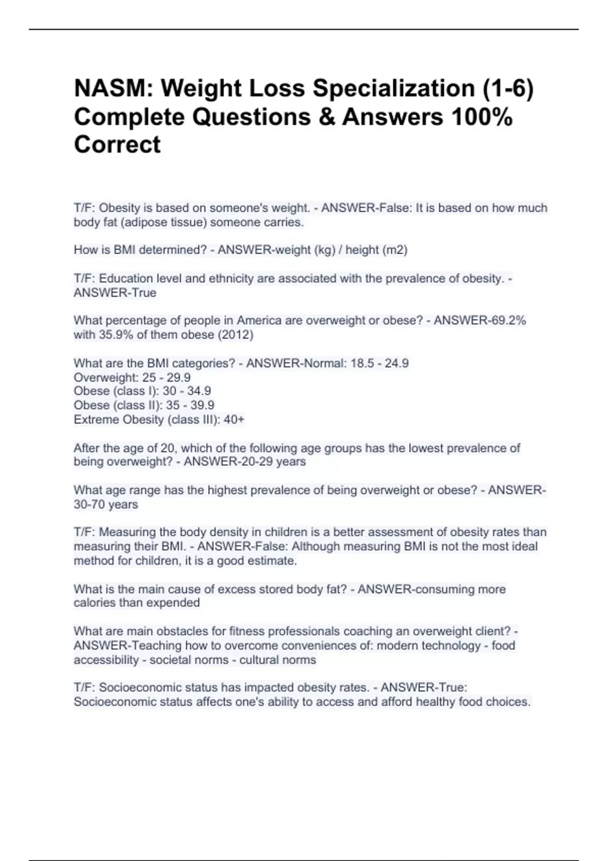 NASM: Weight Loss Specialization (1-6) Complete Questions & Answers 100% Correct