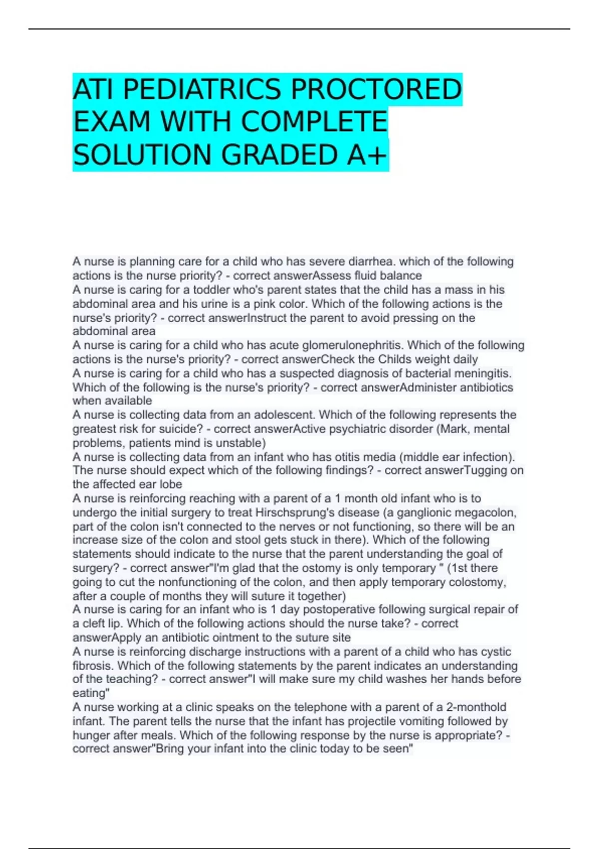 ATI PEDIATRICS PROCTORED EXAM WITH COMPLETE SOLUTION GRADED A+ A nurse is planning care for a child who has severe diarrhea. which of the following actions is the nurse priority? - correct answerAssess fluid balance A nurse is caring for a toddler who's parent states that the child has a mass in his abdominal area and his urine is a pink color. Which of the following actions is the nurse's priority? - correct answerInstruct the parent to avoid pressing on the abdominal area A nurse is caring for a child who has acute glomerulonephritis. Which of the following actions is the nurse's priority? - correct answerCheck the Childs weight daily A nurse is caring for a child who has a suspected diagnosis of bacterial meningitis. Which of the following is the nurse's priority? - correct answerAdminister antibiotics when available A nurse is collecting data from an adolescent. Which of the following represents the greatest risk for suicide? - correct answerActive psychiatric disorder (Mark, mental problems, patients mind is unstable) A nurse is collecting data from an infant who has otitis media (middle ear infection). The nurse should expect which of the following findings? - correct answerTugging on the affected ear lobe A nurse is reinforcing reaching with a parent of a 1 month old infant who is to undergo the initial surgery to treat Hirschsprung's disease (a ganglionic megacolon, part of the colon isn't connected to the nerves or not functioning, so there will be an increase size of the colon and stool gets stuck in there). Which of the following statements should indicate to the nurse that the parent understanding the goal of surgery? - correct answer"I'm glad that the ostomy is only temporary " (1st there going to cut the nonfunctioning of the colon, and then apply temporary colostomy, after a couple of months they will suture it together) A nurse is caring for an infant who is 1 day postoperative following surgical repair of a cleft lip. Which of the following actions should the nurse take? - correct answerApply an antibiotic ointment to the suture site A nurse is reinforcing discharge instructions with a parent of a child who has cystic fibrosis. Which of the following statements by the parent indicates an understanding of the teaching? - correct answer"I will make sure my child washes her hands before eating" A nurse working at a clinic speaks on the telephone with a parent of a 2-monthold infant. The parent tells the nurse that the infant has projectile vomiting followed by hunger after meals. Which of the following response by the nurse is appropriate? - correct answer"Bring your infant into the clinic today to be seen" A nurse is caring for a 4 year old child who is 2 days postoperative following the insertion of a ventriculoperitoneal shunt. Which of the following findings should the nurse identify as the priority . (causes icp hydrocephalus) - correct answerlethargy (high pitched cry, respiratory changes, bradycardia, wide pulse pressure, irritability a nurse is caring for a child following an open reduction and internal fixation of a fractured femur and application of a cast. The cast has a window cut in it for viewing of the incision. Which of the following actions should the nurse take first? - correct answerPerform neurovascular checks of the affected extremity (check for infection, color, capillary refill, redness) A nurse is an urgent care clinic is assisting with the care of a toddler who ingested 30 tablets of aspirin. Which of the following substances should the nurse administer to the toddler? - correct answerActivated charcoal (can work with toxin, poison. Given through ng tube absorbs toxins) A nurse is caring for a 3 year old client who has persistent otitis media. To help identify contributing factors, the nurse should ask the parents which of the following questions? - correct answerDoes anyone smoke in the same house as your daughter? (smoking can cause irritation, cause mucus in respiratory and causes otitis media?) (otitis media is purulent color) A nurse is collecting data from a 2 year old toddler who has AIDS. The nurse should inspect inside the toddler mouth for which of the following opportunistic infections (fungus infections is usually opportunistic infections)? - correct answerCandidiasis (also called oral thrush) A nurse is caring for a 4 year old child who has dehydration. Which of the following findings should the nurse identify as the priority? - correct answerPotassium 2.5 mEq/L A nurse is caring for a child who Is postoperative following the insertion of a ventriculorperitoneal shunt. The nurse should place the child in which of the following positions? - correct answerOn the nonoperative side A nurse is caring for an infant who is dehydrated and requires IV therapy. The nurse should monitor the infant response to therapy by performing which of the following actions? - correct answerweighing the infants at the same time everyday A nurse is caring for a preschool age child who has croup. Which of the following findings should the nurse report to the provider? - correct answerDrooling (that could mean it can mean there's an epiglottitis causes obstruction of the airway) A nurse is collecting data from an infant who has hypertrophic pyloric stenosis. Which of the following findings should the nurse expect? - correct answerProjectile vomiting A school nurse is screening an 11-year-old child for idiopathic scoliosis. Which of the following instructions should the nurse give the child for this examination? - correct answerBend forward from the waist with your head and arms downward A nurse is collecting data from an infact. Which of the following sites is the most reliable location to check the infats pulse ? - correct answerApical A nurse is reinforcing teaching with a parent of a child who has eczema. Which of th following instructions should the nurse include in the teaching - correct answerApply a cool wet compress to the affected area A nurse is caring 