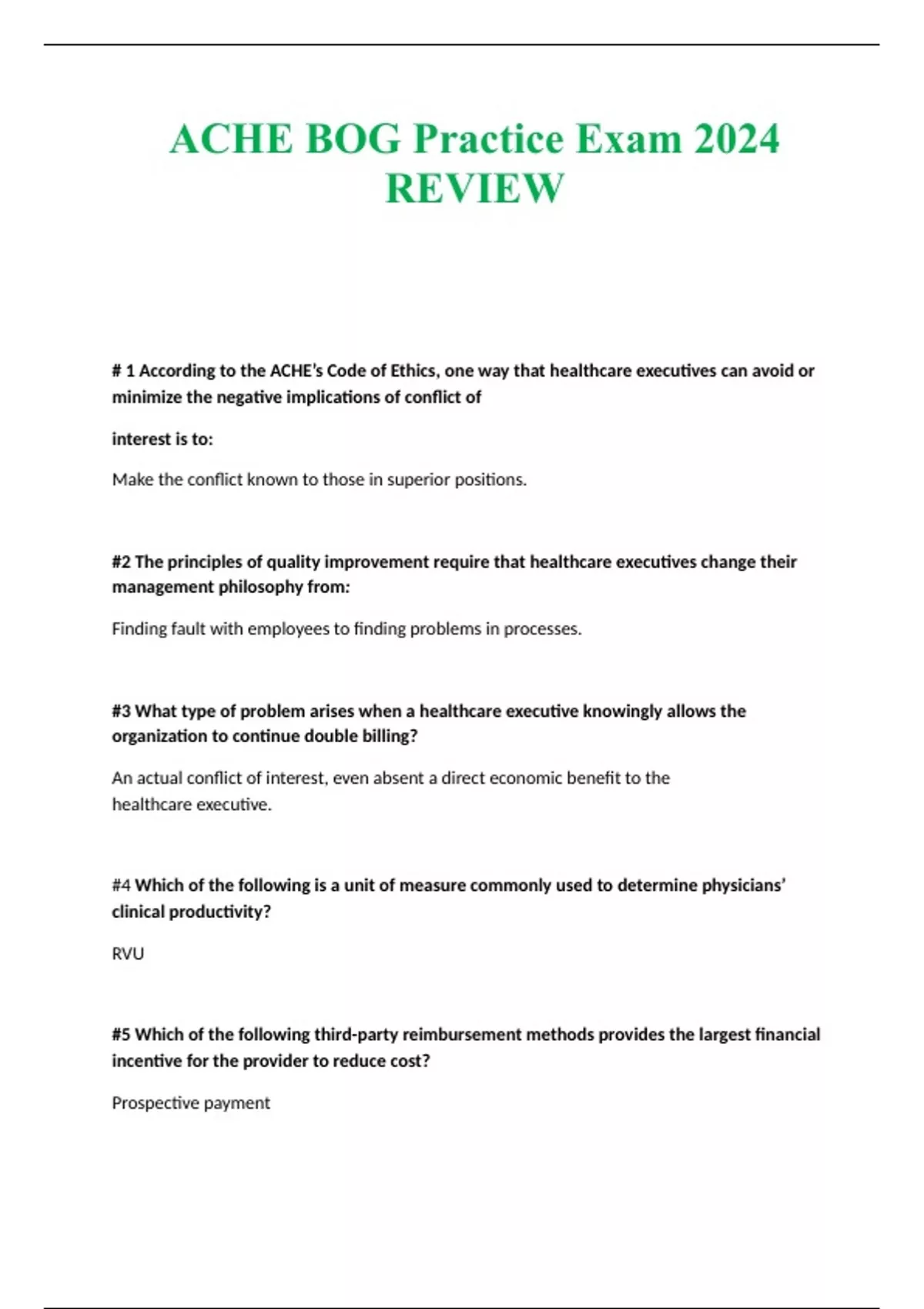 ACHE BOG Practice Exam 2024 REVIEW # 1 According to the ACHE’s Code of Ethics, one way that healthcare executives can avoid or minimize the negative implications of conflict of interest is to: Make the conflict known to those in superior positions. #2 The principles of quality improvement require that healthcare executives change their management philosophy from: Finding fault with employees to finding problems in processes. #3 What type of problem arises when a healthcare executive knowingly allows the organization to continue double billing? An actual conflict of interest, even absent a direct economic benefit to the healthcare executive. #4 Which of the following is a unit of measure commonly used to determine physicians’ clinical productivity? RVU #5 Which of the following third-party reimbursement methods provides the largest financial incentive for the provider to reduce cost? Prospective payment #6 Statements of earnings, financial positions, changes in financial position and retained earnings are required to be submitted yearly by all: Publicly owned healthcare organizations. #181 In a healthcare organization, who has ultimate fiduciary responsibility? Board of directors #182 Medicare DRG payment is highly dependent upon a hospital’s case mix index. This index represents the average relative weight for all Medicare patients treated in a: Specific period #183 If a CEO wanted to look at a “snapshot” of the financial condition of the healthcare organization, he/she would review which of the following? Balance Sheet #184 Where should charity care be shown in a healthcare organization’s financial statement? In the notes to the financial statements #185 Which of the following is the best way to assign costs in responsibility management Assign costs to the department manager who is responsible for making decisions about those costs #186 You are planning to conduct an assessment of the utilization patterns in your organization’s emergency department over the past three years. Which of the following techniques would be most appropriate? Trend Analysis #187 A manager who seeks input from others prior to making a decision is engaging in which leadership style? Participative
